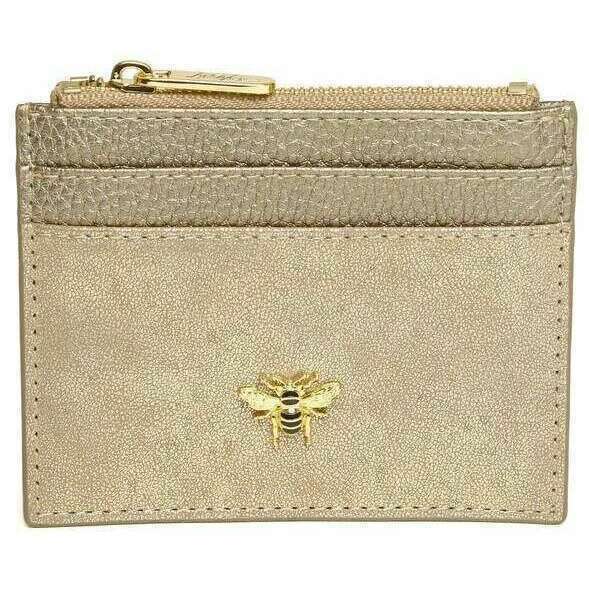 • 4 ranuras para tarjetas, compartimento de efectivo de cierre de la cremallera, logotipo de Honeybee en el frente, hardware de metal dorado