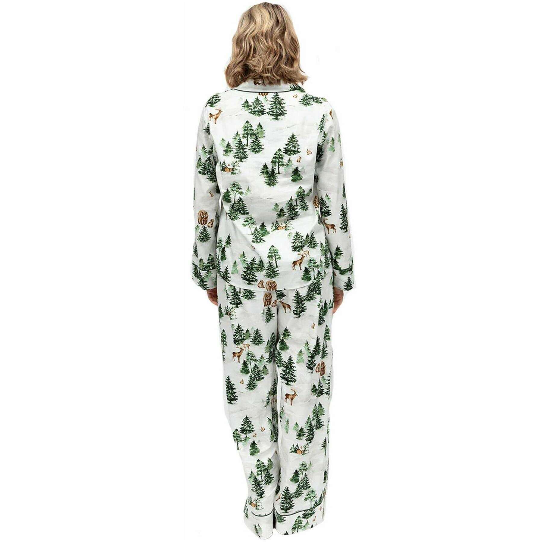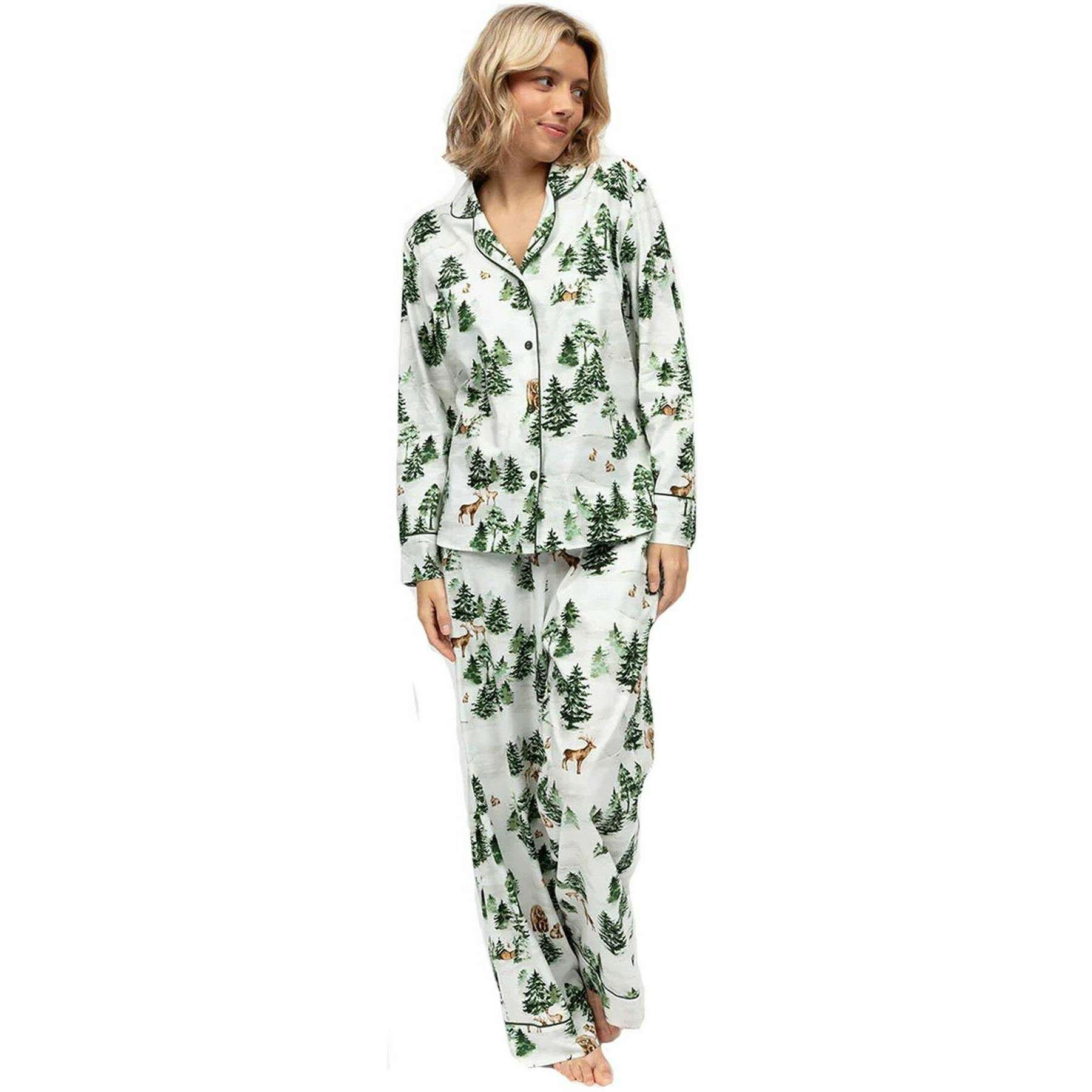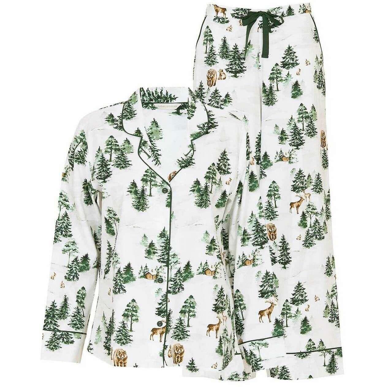Este conjunto de pijama de punto con estampado alpino de helecho para mujer de la marca Cyberjammies está confeccionado con 60% algodón y 40% modal y se presenta en verde. Además, el pijama verde oliva/blanco está diseñado con un patrón floral. Se recomienda lavar a máquina del revés, no remojar, lavar con colores similares para mantener este pijama en buenas condiciones. Todos los pijamas vienen completos con etiquetas de cyberjammies. El conjunto de pijama de jersey con estampado alpino Fern de Cyberjammies - verde oliva/blanco aporta un acogedor ambiente invernal a tu tiempo libre. Confeccionado con una suave mezcla de algodón y modal, este conjunto presenta un sereno estampado alpino de pinos, cabañas y animales del bosque sobre un fondo blanco nítido. La parte superior incluye un cuello con solapas, ribetes verde oliva y botones cubiertos para un acabado entallado, mientras que la parte inferior de pierna ancha ofrece una espalda elástica, frente plano, cordón ajustable y bolsillos laterales para mayor comodidad y facilidad. Perfecto para mañanas festivas o noches relajadas, este conjunto combina el encanto de la temporada con el lujo cotidiano.