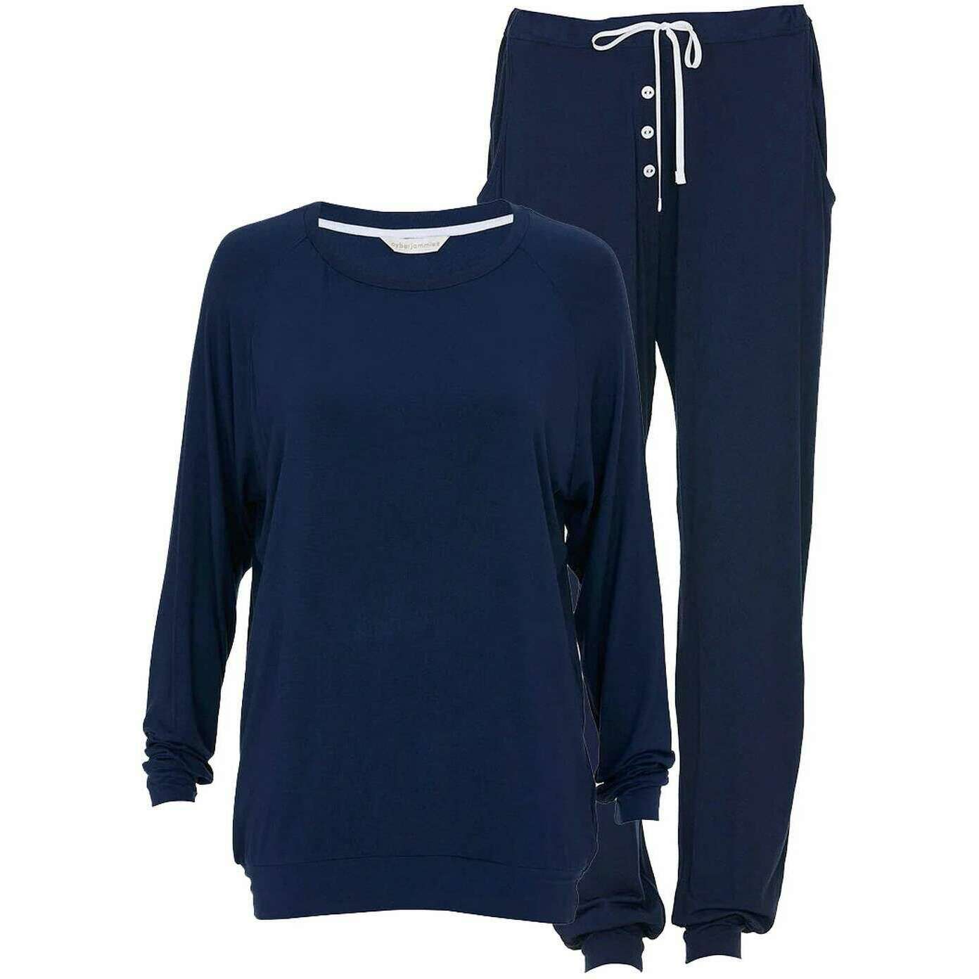 Este pijama de punto deportivo holgado para mujer de la marca Cyberjammies está confeccionado con 95% modal y 5% elastano y se presenta en azul marino. Además, el pijama azul marino está diseñado con un patrón liso. Se recomienda lavar a máquina del revés, no remojar, lavar con colores similares para mantener este pijama en buenas condiciones. Todos los pijamas vienen completos con etiquetas de cyberjammies. El conjunto de pijama Cyberjammies Marina Slouch Jersey - Navy hará que esos momentos cómodos sean aún más cómodos. Use estos pijamas simplemente hermosos, holgados pero no demasiado holgados cuando esté descansando en casa y deléitese con el material suave y elástico y abrácelos como una segunda piel. La parte inferior presenta una cinturilla elástica con botones planos y un cordón ajustable para garantizar una comodidad absoluta. Diseñado cuidadosamente para noches de descanso y mañanas relajadas, el pijama Jersey Slouch se convertirá en un elemento básico de tu colección.