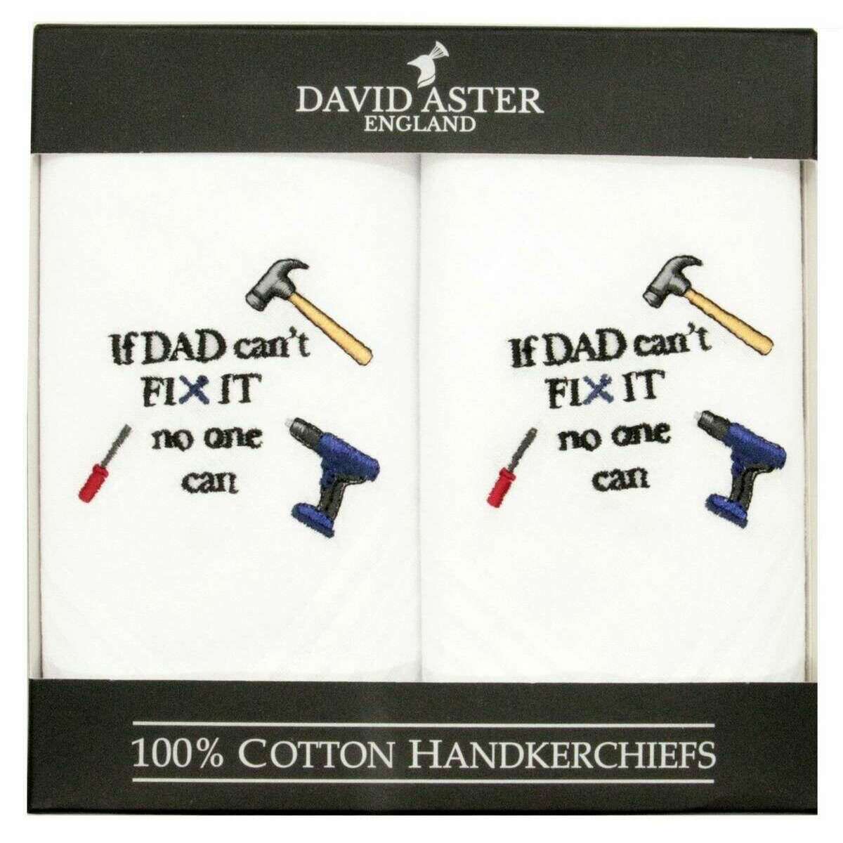 Estos pañuelos bordados para hombre bien hechos de David Aster vienen en color blanco y están fabricados en 100% algodón. El paquete de 2 pañuelos tiene una buena relación calidad-precio, lo que garantiza que sean una buena compra. Todos los pañuelos vienen completos con una caja de presentación de David Aster. Los pañuelos bordados de bricolaje David Aster - Blanco son un paquete impresionante que incluye una frase de bricolaje de papá en cada uno con un fondo blanco. Seguro que impresionará, le garantizará que le dará a su atuendo el acabado perfecto y un aspecto moderno debido a su diseño personalizado que lo hará destacar entre la multitud. Haga de este un gran regalo para cualquier papá al que le guste hacer bricolaje.