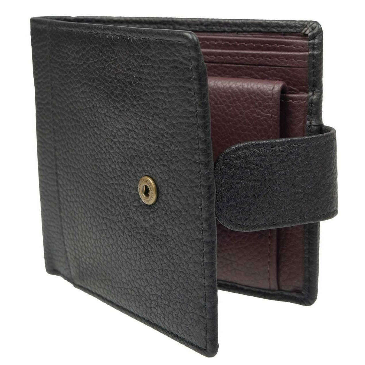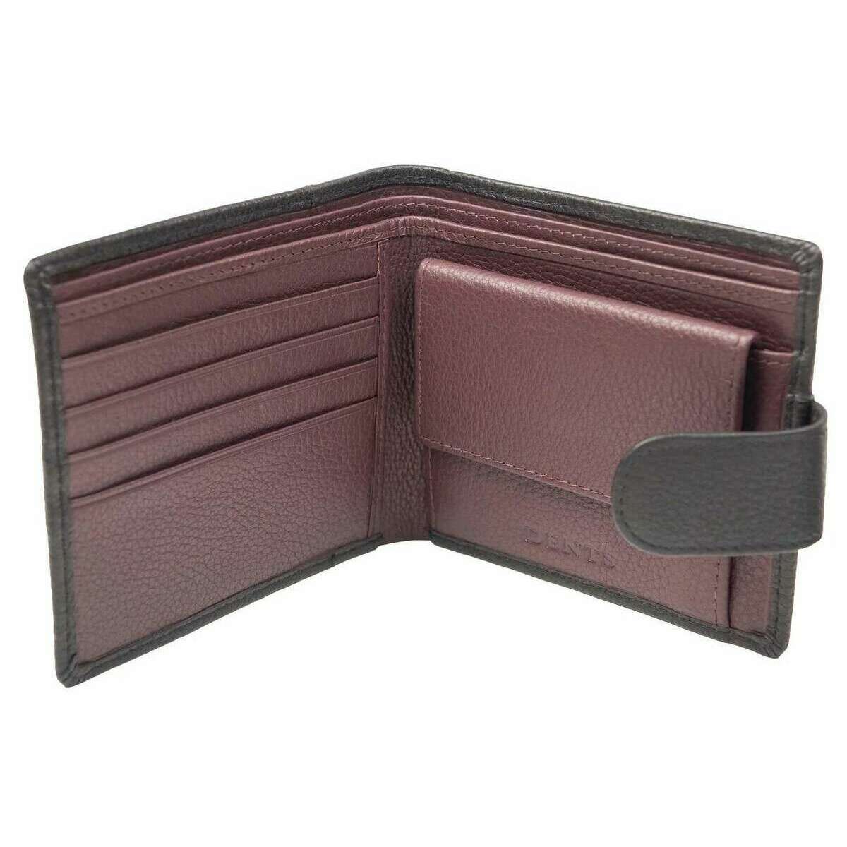 Con cuero negro 100 % flor granulada, esta billetera plegable Cherwell Coin de Dents es perfecta para hombres y una prenda imprescindible. Mide 10 cm (alto) x 11 cm (ancho). Todas las carteras vienen completas con etiquetas para abolladuras. La billetera plegable Dents Cherwell Coin - Negro/Burdeos Burdeos cuenta con cuatro bolsillos para tarjetas, dos secciones para billetes, dos bolsillos abiertos y un bolsillo para monedas. ¡Esta billetera plegable es el regalo perfecto! El panel frontal tiene una pestaña con un cierre de botón prensado de latón antiguo para mantener la billetera cerrada. Forrado con tela de sarga de poliéster para una apariencia suave y elegante, este elegante accesorio tiene una elegancia informal.