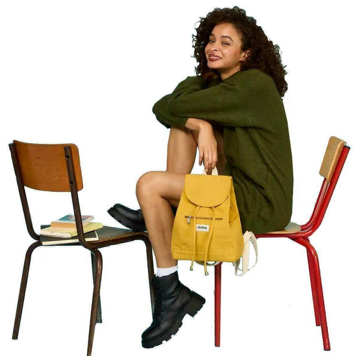 Esta pequeña mochila unisex Mini Eliot de la marca Hindbag está hecha de algodón 100% orgánico y se exhibe en amarillo. Mide 31 cm (altura) x 24 cm (ancho) x 13cm (profundidad). Todas las bolsas vienen completas con empaque de sacos traseros. La mínima mínima mínima de la bolsa hindúdica: el amarillo de azafrán es adecuado para jóvenes y mayores! Con dos bolsillos exteriores y un bolsillo interior, puede deslizar lo que necesita mientras mantiene las manos libres. El diseño atemporal de este mini mochila combina el encanto vintage con la funcionalidad moderna, lo que los convierte en una opción popular para el uso diario.