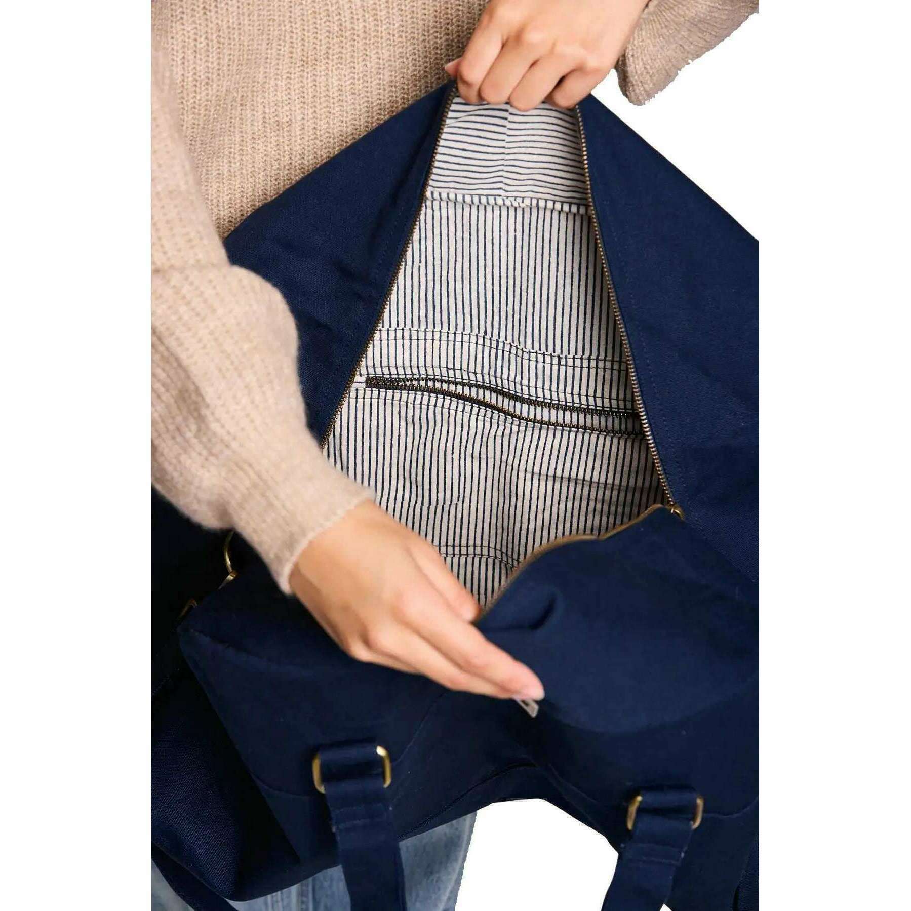 Esta gran bolsa de viaje de Yves para hombres o mujeres está diseñada por la marca Hindbag en un color azul y está hecha de algodón 100% orgánico. Mide 33 cm (altura) x 54 cm (ancho) x 24 cm (profundidad). Todas las bolsas vienen completas con empaque de sacos traseros. La bolsa de viaje grande de la bolsa trasera: azul marino es una opción espaciosa y ecológica para los viajeros. Hecho a partir de algodón orgánico grueso y certificado por GOTS, esta bolsa presenta múltiples bolsillos para la organización, un cierre seguro de cremallera y un forro interno impreso que agrega un toque de elegancia. Con sus manijas y una gran correa de hombro ajustable, esta bolsa se puede transportar fácilmente a mano o en el hombro.
