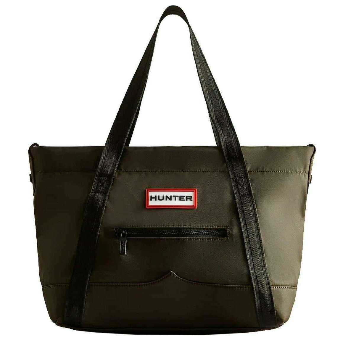 Utilizando 100 % nailon verde, este bolso tote midi de nailon con clip superior de Hunter es perfecto para hombres o mujeres y es imprescindible. Mide 30 cm (alto) x 46 cm (ancho) x 14 cm (profundidad). Todas las bolsas vienen completas con embalaje Hunter. El bolso tote Hunter Nylon Midi Topclip - Verde oliva oscuro cuenta con asas de transporte y una correa cruzada ajustable para mayor versatilidad. Este bolso ha sido elaborado con materiales totalmente veganos resistentes al agua para garantizar un uso seco en cualquier clima o accidente. La gran capacidad permite espacio para todos sus elementos esenciales con la cómoda cremallera frontal y los bolsillos internos. La correa ajustable superior acolchada garantiza una comodidad óptima durante tus aventuras. Completando este estilo elegante y clásico se encuentra la etiqueta de silicona Hunter en el frente.