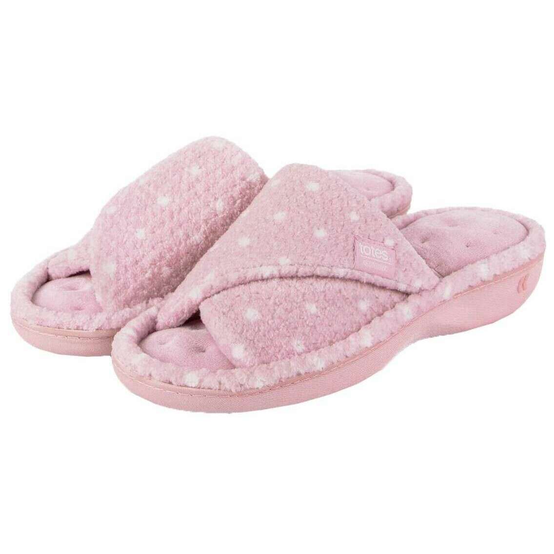 Estas pantuflas con punta abierta para mujer de la marca Isotoner están hechas de 100% poliéster y se presentan en rosa. Además, las pantuflas de lunares rosas están diseñadas con un patrón de manchas. Se recomienda lavar a máquina a 30 grados para mantener estas pantuflas en buenas condiciones. Todas las zapatillas se entregan completas con un embalaje de isotóner. Las pantuflas con punta abierta Isotoner Popcorn Turnover - Pink Spot ofrecen comodidad, soporte y calidez excepcionales. Con espuma con memoria de confort envolvente 360 ​​y tecnología acolchada con una capa de espuma, se sentirá como si estuviera caminando sobre una nube con la suela extra secreta para brindar soporte al talón, el arco y los dedos de los pies. Este estilo de mula con vuelta mantendrá tus pies agradables y calentitos con los materiales suaves y esponjosos, a la vez que será transpirable con la espalda y los dedos abiertos.