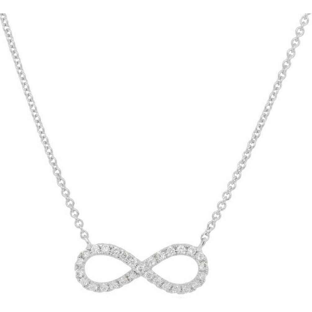 Perfecto para las mujeres es este collar infinito de oro blanco y diamantes transparentes de Mark Milton; también está hecho de oro de 9 quilates. Mide 46 cm (largo). Todos los collares vienen completos con el embalaje de Mark Milton. El collar infinito de diamantes de Mark Milton - Oro blanco/transparente presenta un colgante de infinito clásico en una cadena de plata. Este collar es simple pero tiene un diseño llamativo, ¡perfecto para el uso diario o perfecto para una ocasión especial!