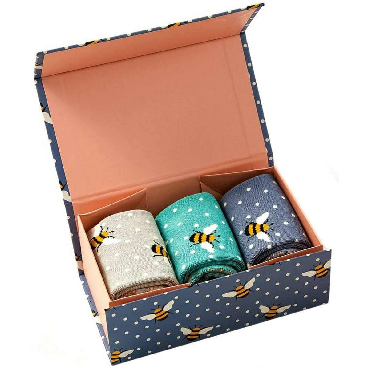 Pack de 3 cajas de calcetines Bumble Bee de Miss Sparrow London - Verde/Azul/Gris