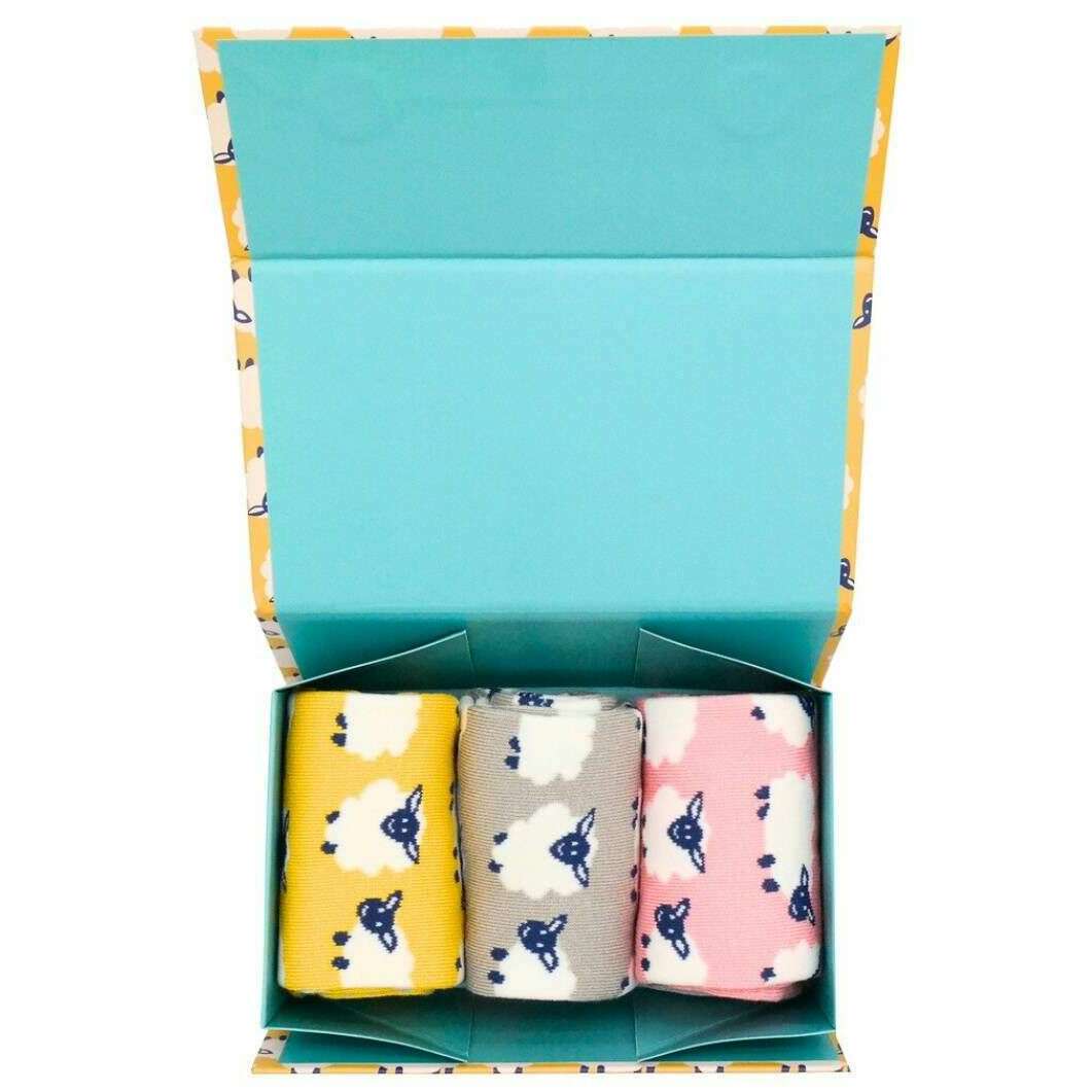 Pack de 3 cajas de calcetines Happy Sheep de Miss Sparrow London - Amarillo/Gris/Rosa