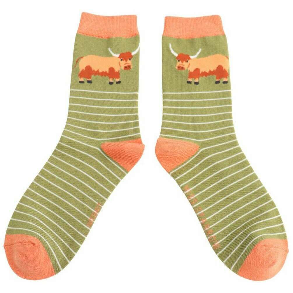 Calcetines de bambú con diseño de vaca y rayas Highland de Miss Sparrow London - Verde musgo