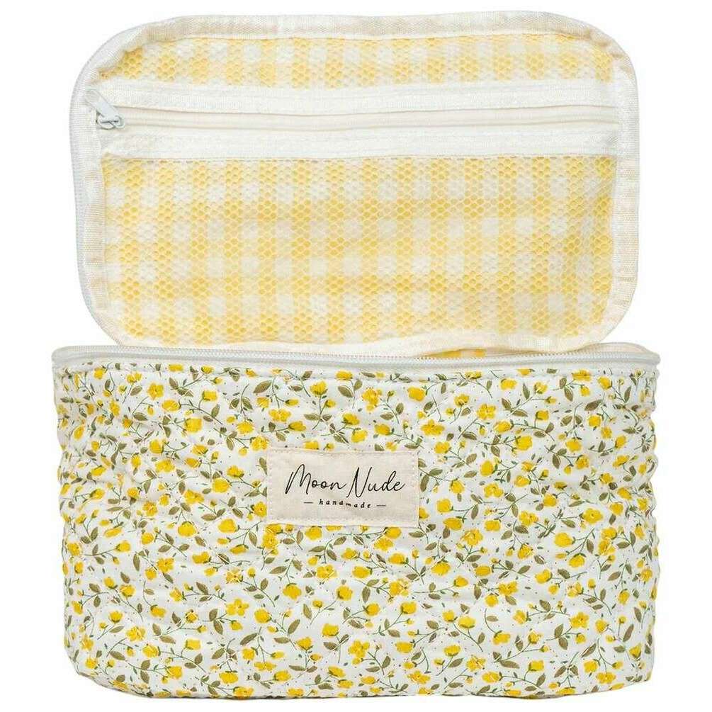 Este neceser de mujer de la marca Moon Nude está confeccionado en 100 % algodón y se presenta en color blanco. Mide 16 cm (alto) x 22 cm (ancho) x 14 cm (profundidad). Se recomienda lavar a mano en agua fría con un detergente suave, o lavar a máquina del revés en ciclo delicado. para mantener esta bolsa en buenas condiciones. Todos los bolsos vienen completos con un embalaje color nude lunar. El neceser Moon Nude Buttercup - Blanco/Amarillo es una necesidad absoluta para viajar o para el uso diario. Este neceser garantiza que mantendrás todo tu maquillaje o cuidado de la piel en un solo lugar, además de ser elegante y a la moda con su diseño acolchado hecho a mano.