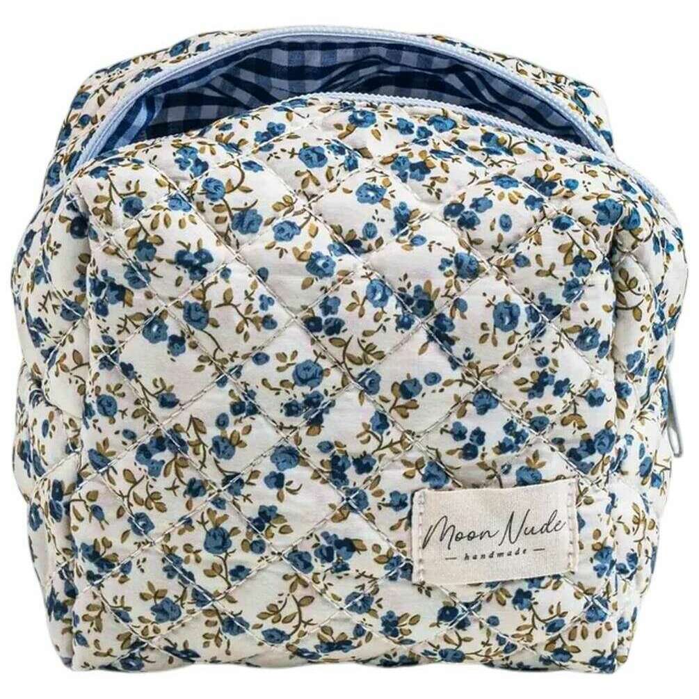 Este mini neceser de maquillaje de primavera para mujer de la marca Moon Nude está confeccionado en 100 % algodón y se presenta en color azul. Mide 13 cm (alto) x 15 cm (ancho) x 11 cm (profundidad). Se recomienda lavar a mano en agua fría con un detergente suave, o lavar a máquina del revés en ciclo delicado. para mantener esta bolsa en buenas condiciones. Todos los bolsos vienen completos con un embalaje color nude lunar. El minineceser de maquillaje Moon Nude Spring - Azul/Verde es una necesidad absoluta para tu habitación o bolso de uso diario. Este neceser de maquillaje garantiza mantener todos tus productos más usados ​​juntos y seguros, a la vez que es elegante y elegante con su diseño acolchado hecho a mano.