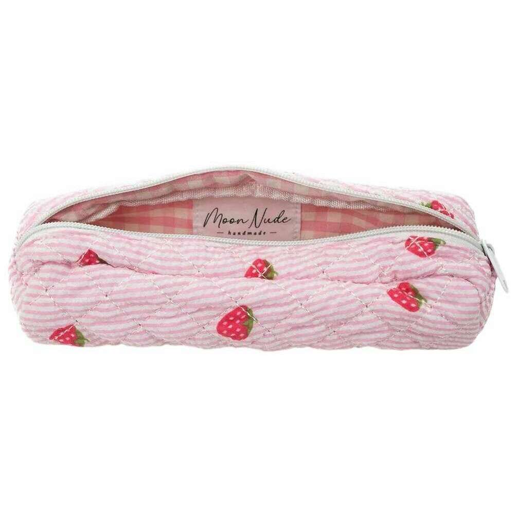 Este estuche de mujer con forma de fresa ha sido confeccionado en 100% algodón, se presenta en color rosa y es de la marca Moon Nude. Mide 7 cm (alto) x 24 cm (ancho) x 6 cm (profundidad). Se recomienda lavar a mano en agua fría con un detergente suave, o lavar a máquina del revés en ciclo delicado. para mantener este estuche en buenas condiciones. Todos los estuches vienen completos con un embalaje color nude luna. El estuche Moon Nude Strawberry - Rosa/Rojo es una necesidad absoluta para el trabajo o la escuela. Este estuche garantiza que mantendrás todos tus artículos de papelería en un solo lugar, a la vez que es elegante y elegante con su diseño acolchado hecho a mano.