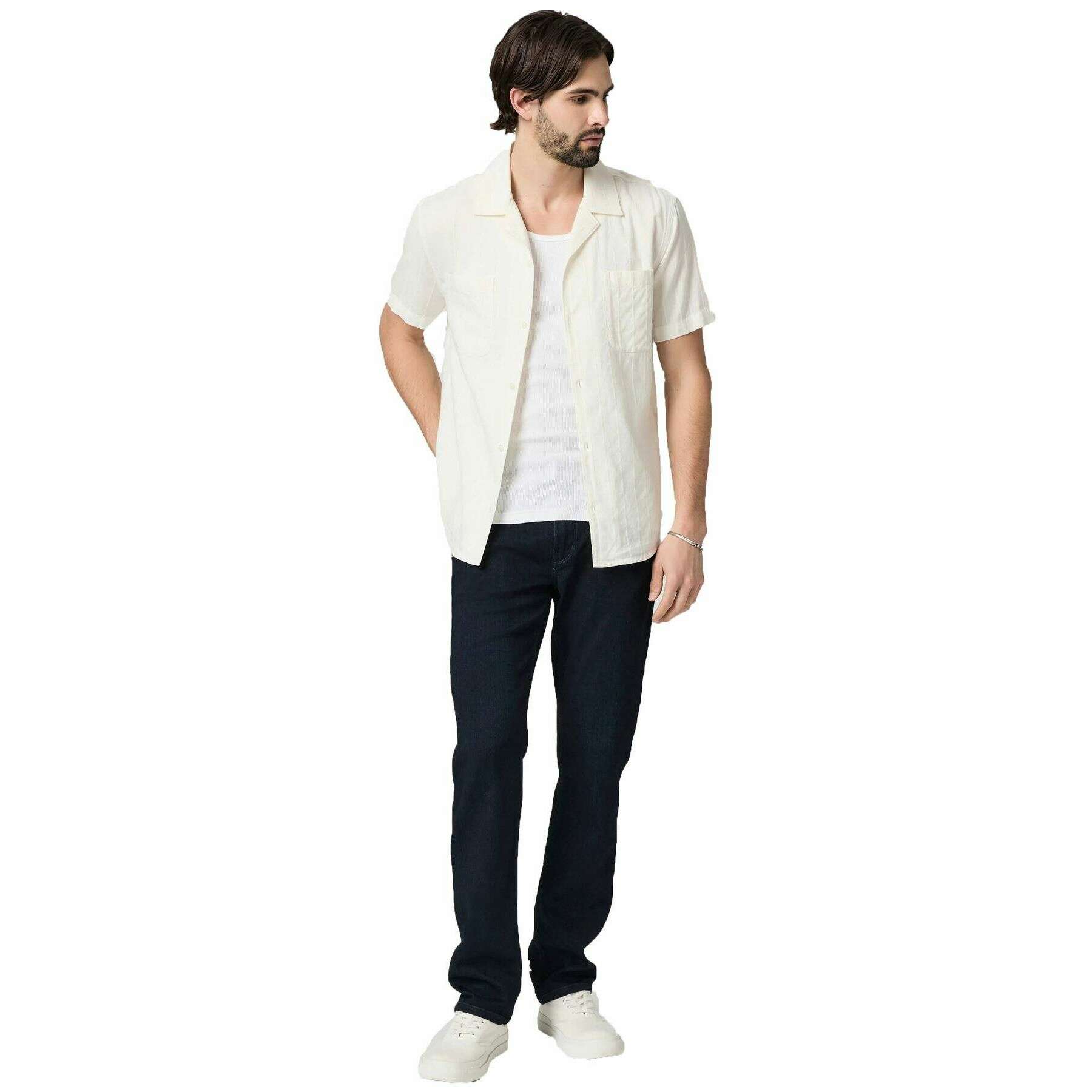 • Tiro de 10 1/4" , Entrepierna de 33 1/2" , Abertura de pierna de 15" , Estiramiento alto , Denim Transcend , Corte recto , Ligera facilidad en la cadera