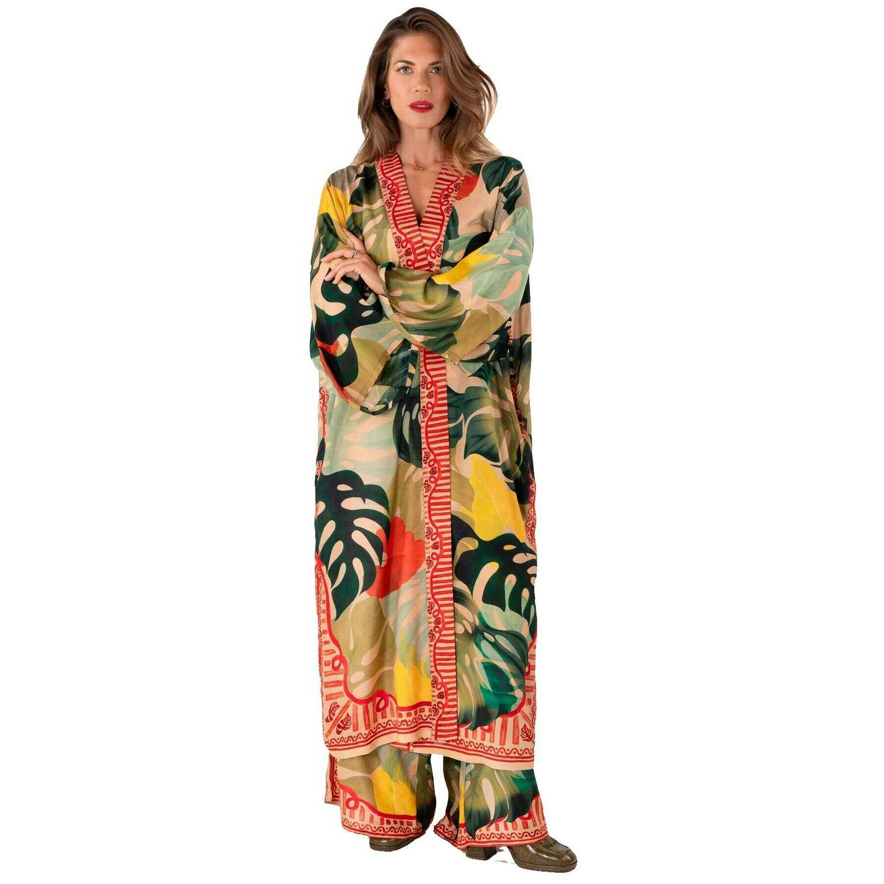 Vestido tipo kimono con hojas exóticas en polvo - Verde/Beige/Amarillo