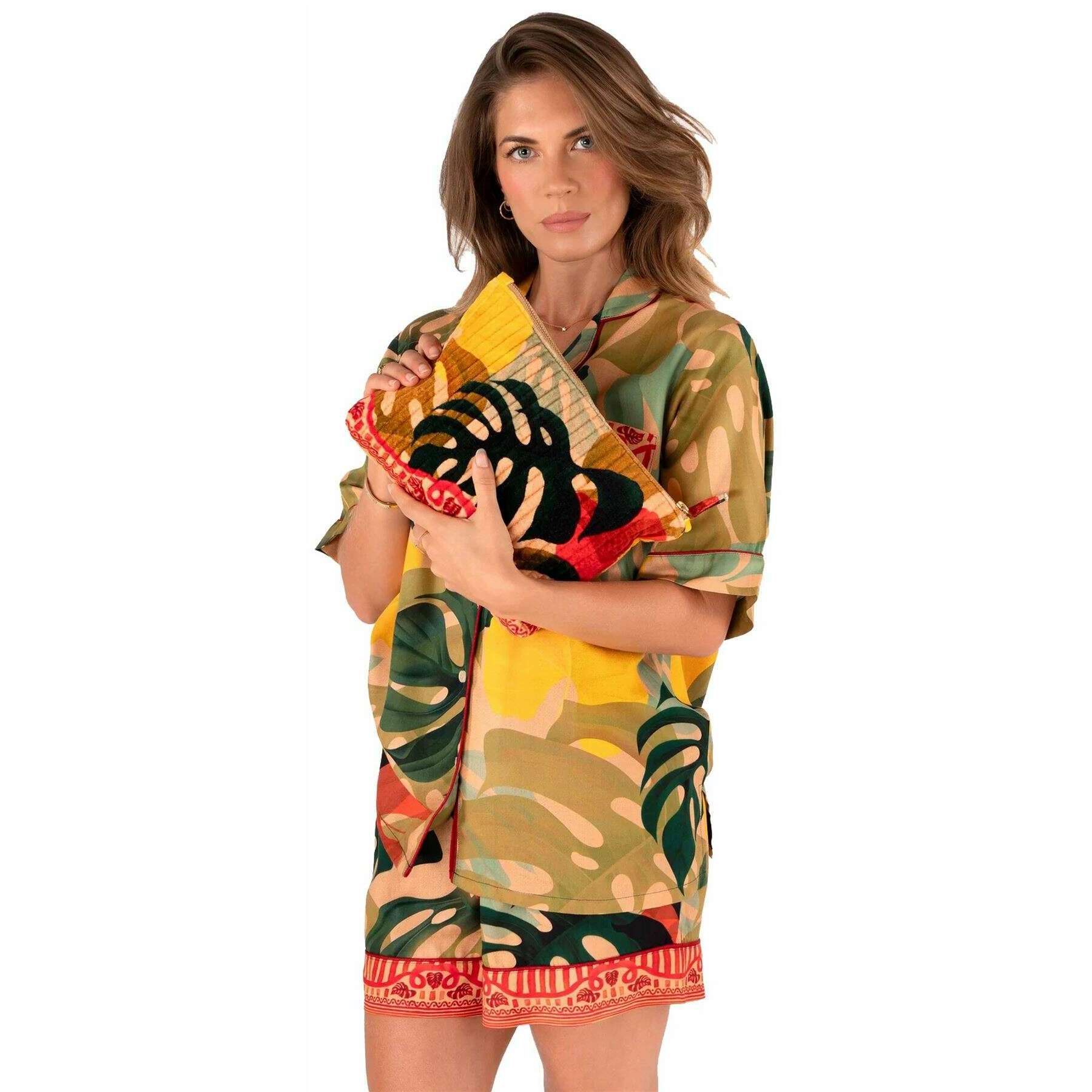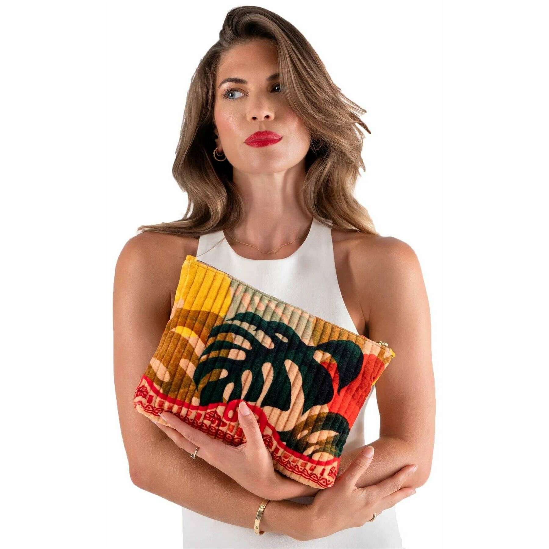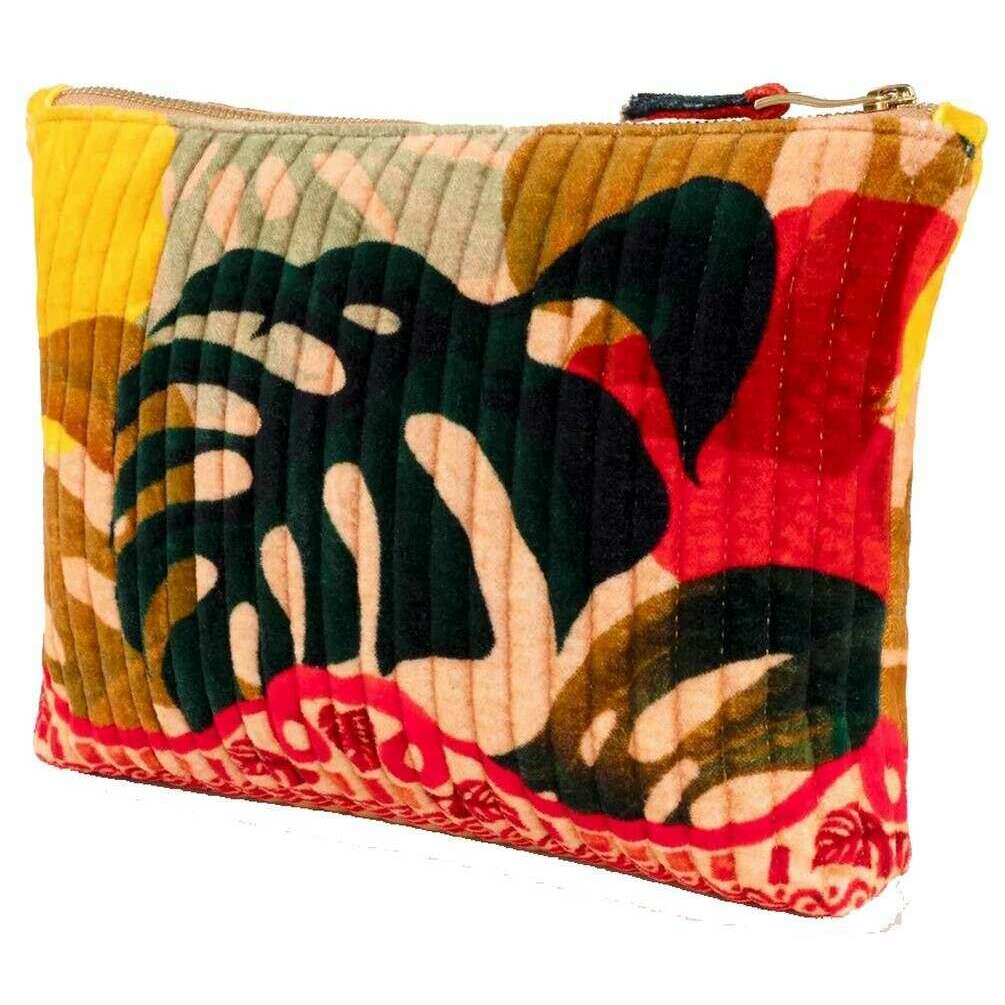 Bolsa acolchada de terciopelo con cremallera y hojas exóticas en polvo - Beige/Rojo/Negro