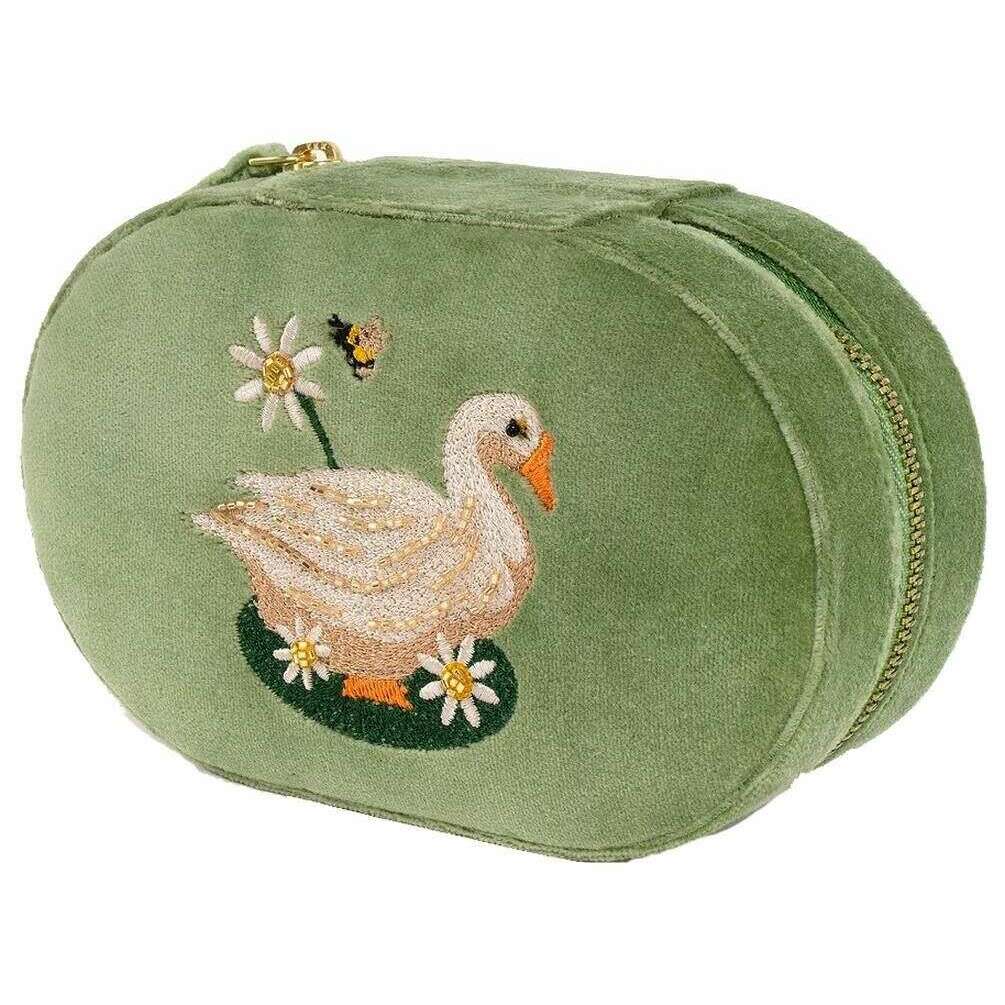 Este joyero ovalado de ganso de jardín para mujer ha sido confeccionado en terciopelo 100% poliéster, se presenta en color verde y es de la marca Powder. Mide 5 cm (alto) x 15 cm (ancho) x 4 cm (profundidad). Todos los joyeros se entregan completos con un embalaje de polvo. El joyero ovalado Powder Garden Goose - Verde/Crema/Naranja es un estuche impresionante que mantendrá sus joyas organizadas de la manera más dulce y elegante. Con una sección para sujetar anillos y dos minibandejas separadas. Perfecto para viajar o simplemente para guardar de forma segura tus piezas favoritas. Este hermoso diseño ovalado crea un gran tamaño para caber en cualquier bolso de su elección cuando está de viaje. El exterior bordado añade un aspecto único y bonito, mientras que la cremallera dorada añade el toque final.