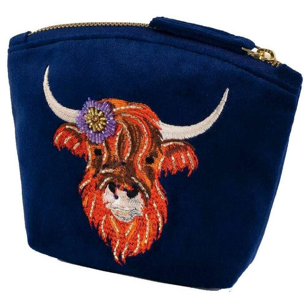 Minibolso de terciopelo bordado Powder Highland Cow - Azul marino/Naranja/Beige