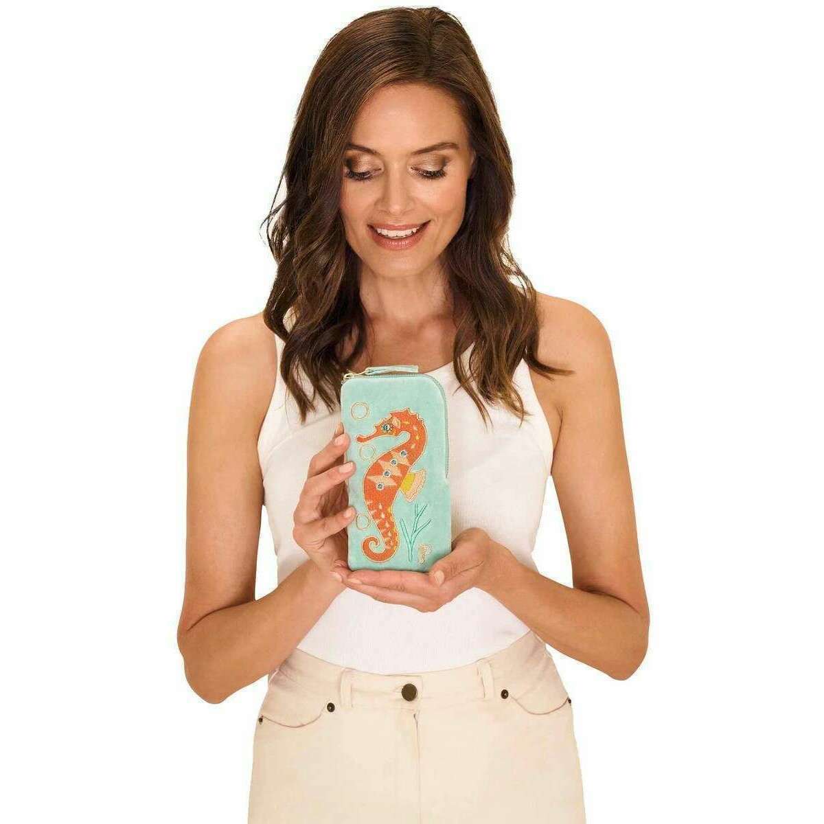 Este estuche de gafas de sol de terciopelo de caballos de caballos de mujer para mujeres ha sido hecha de terciopelo 100% poliéster, presentado en un color azul y proviene de la marca en polvo. Todos los casos de accesorios vienen completos con una bolsa de regalo de polvo de cortesía. El estuche de gafas de sol de terciopelo de caballos de mar en polvo: Aqua Blue nivelará su juego de gafas de sol, manteniéndolas seguras y protegidas con estilo. El diseño bordado a mano traerá un toque de diversión a su día cotidiano. Además de hermoso, el diseño también es práctico con un cierre con cremallera simplista pero seguro, lo que le permite un fácil acceso a sus gafas de sol para cuando las necesite.