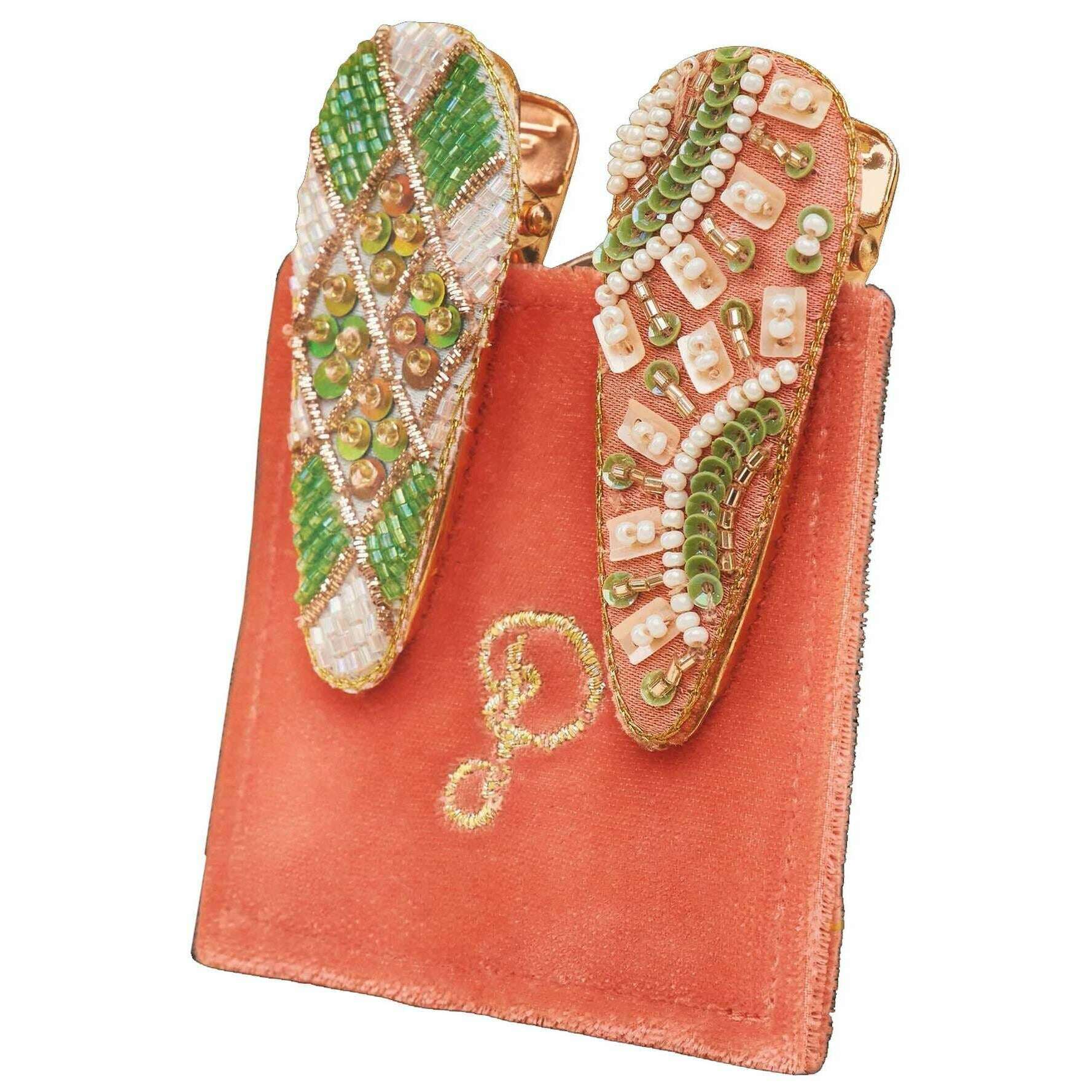 Fabricadas en terciopelo 100% poliéster, estas pinzas para el cabello para mujer en color rosa, verde y crema del diseñador Powder. Mide 8 cm (alto) x 7 cm (ancho). El paquete de 2 accesorios para el cabello tiene una buena relación calidad-precio, lo que garantiza que sean una buena compra. Todos los accesorios para el cabello vienen completos con un paquete de polvo. Las pinzas para el cabello Powder Sunny - Rosa/Verde/Crema mejorarán tu estilo de cabello en cualquier ocasión, agregando un estilo elegante que dejará boquiabierto a la gente. Bellamente adornado con un intrincado diseño de cuentas y bordado, este juego de 2 pinzas para el cabello es imprescindible para tu colección.