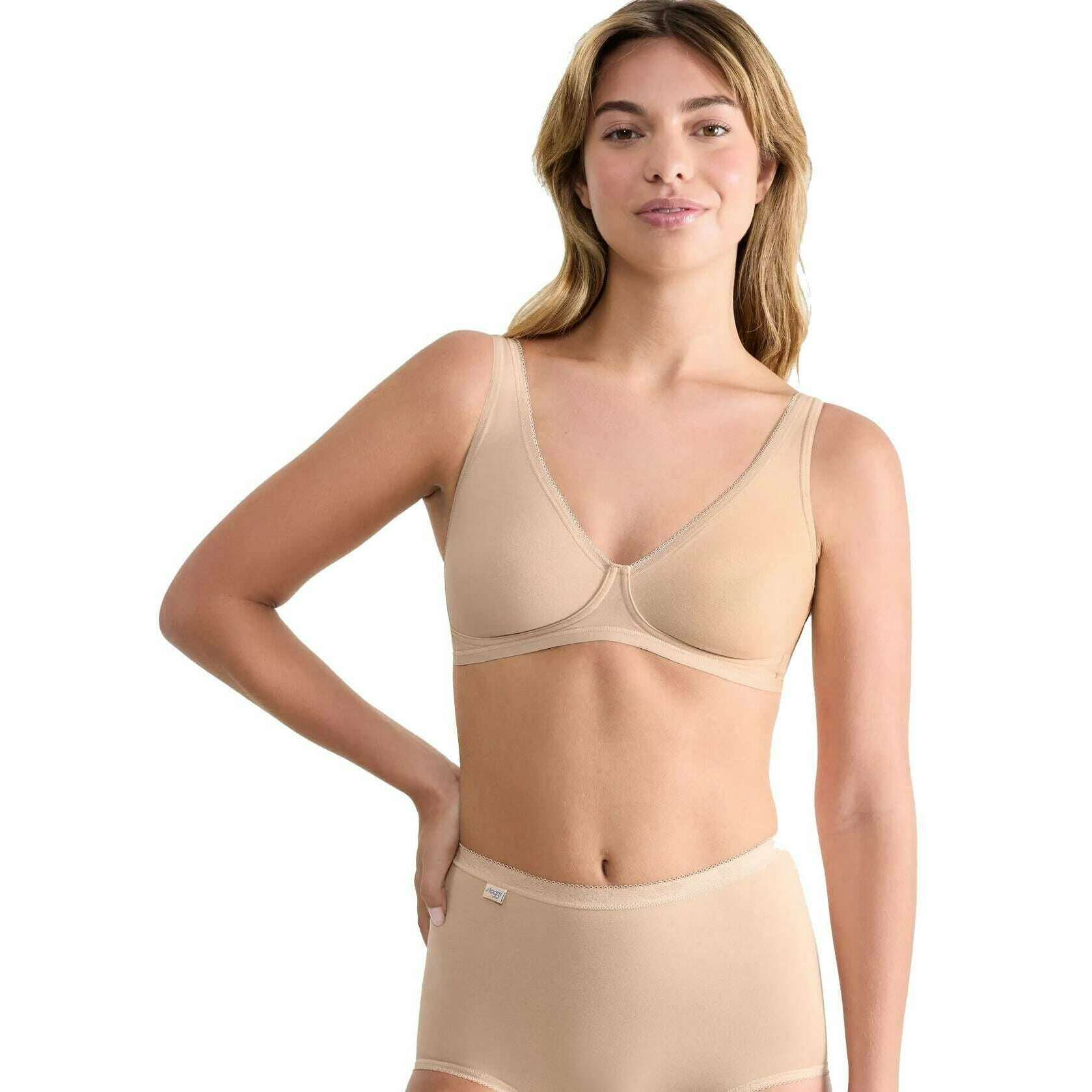 Este sujetador básico+ suave para mujer de la marca Sloggi está confeccionado en 80% algodón, 18% elastano y 2% poliamida y se presenta en color beige. Además, la ropa interior beige piel está diseñada con un patrón liso. Se recomienda lavar a máquina a 40 grados para mantener esta ropa interior en buenas condiciones. Toda la ropa interior se entrega completa con un embalaje sloggi. El sujetador suave Sloggi Basic+ - Skin Beige es imprescindible para las mujeres que buscan máxima comodidad y lujo. Este sujetador ha sido confeccionado con algodón orgánico de alta calidad, diseñado para durar y al mismo tiempo mantener su tacto suave y elasticidad. Las copas moldeadas sin relleno, el soporte medio y las correas ajustables más anchas se han diseñado cuidadosamente para garantizar un ajuste cómodo para el uso diario, y el ajuste sin costuras brinda una apariencia invisible debajo de cualquier atuendo.