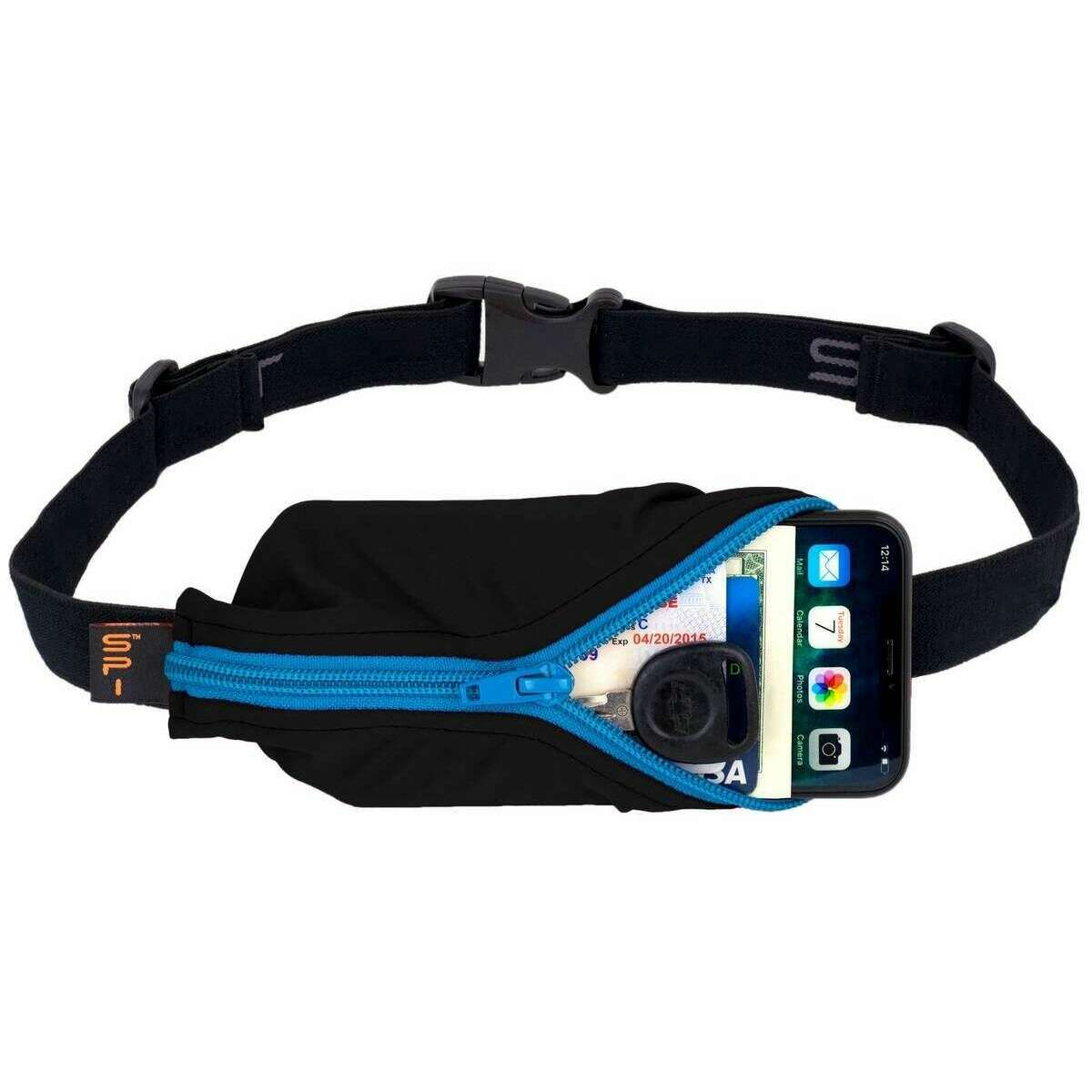 Este cinturón unisex para correr con bolsillo grande de la marca SPIbelt está hecho de elástico y se presenta en negro. Todos los cinturones vienen completos con etiqueta spibelt. ¡El cinturón para correr con bolsillo grande SPIbelt - Negro/Turquesa es perfecto para un trote ligero o una maratón completa! Este cinturón de fitness viene con un bolsillo de perfil bajo para guardar todos sus accesorios de ejercicio, auriculares, llaves, identificación y tarjetas de crédito de forma segura y a mano. Se expande para llevar lo que necesitas y se adapta a todos los tamaños de teléfono. No rebota, se puede usar debajo de la ropa o encima y el elástico suave y cómodo evita rozaduras.