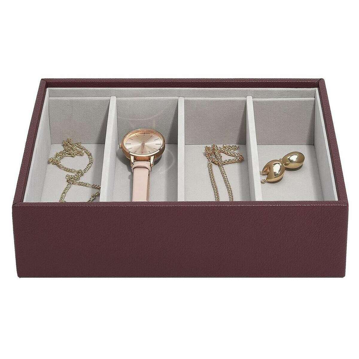 Esta clásica capa de accesorios para gafas para mujer de la marca Stackers está confeccionada en piel sintética y terciopelo y se presenta en color burdeos. Mide 6 cm (alto) x 25 cm (ancho) x 18 cm (profundidad). Todos los joyeros se entregan completos con embalaje apilador. La capa de accesorios para gafas Stackers Classic - Borgoña cuenta con cuatro secciones más grandes para cualquiera de sus artículos de joyería más grandes. Esta hermosa capa de joyería de color burdeos es perfecta para guardar artículos más grandes, como gafas de sol, relojes y pulseras.