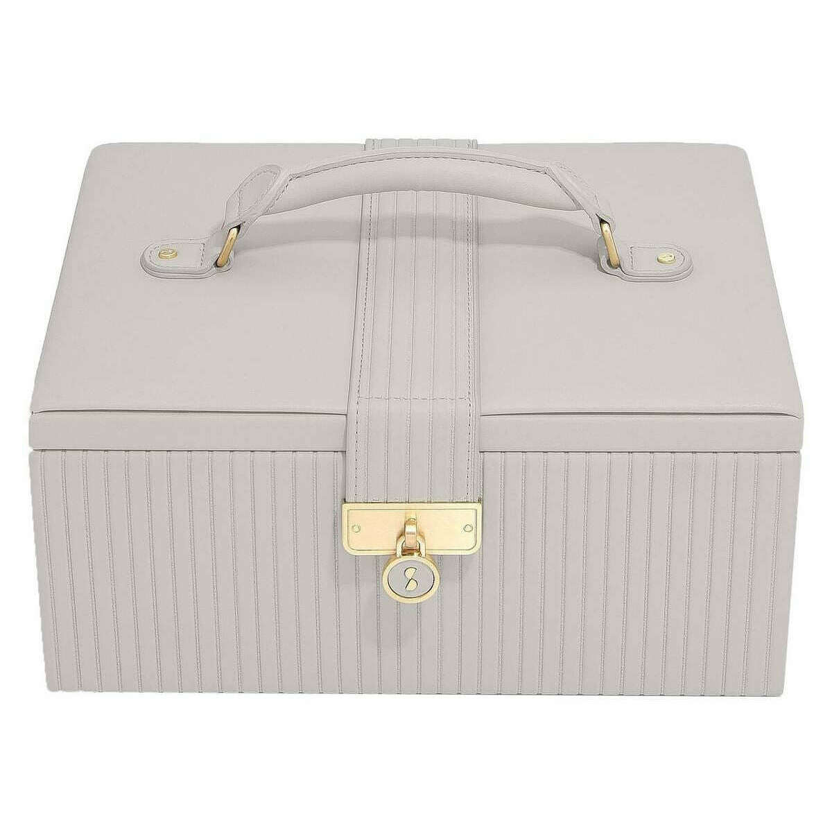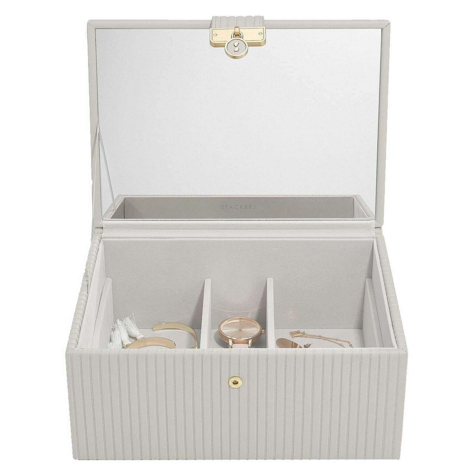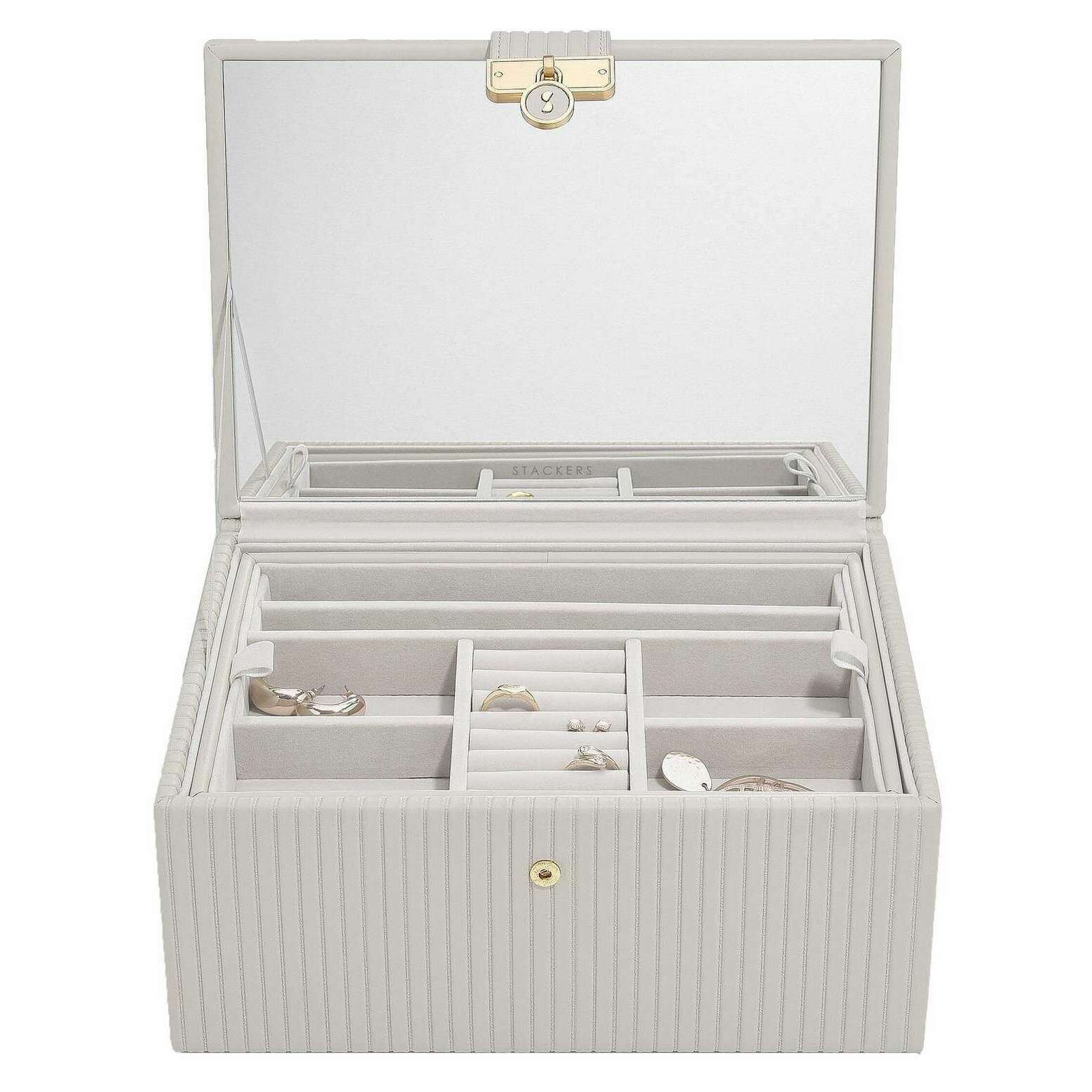 Este joyero clásico para mujer está diseñado por la marca Stackers en color gris y está fabricado en piel sintética y terciopelo. Mide 16,3 cm (alto) x 25 cm (ancho) x 18 cm (profundidad). Todos los joyeros se entregan completos con embalaje apilador. El joyero clásico Stackers - Limestone Grey presenta un hermoso diseño acanalado gris, lo que le da a este joyero un aspecto elegante y sofisticado. Completo con rollos para anillos y aretes, así como una sección más grande debajo para joyas y accesorios más gruesos.