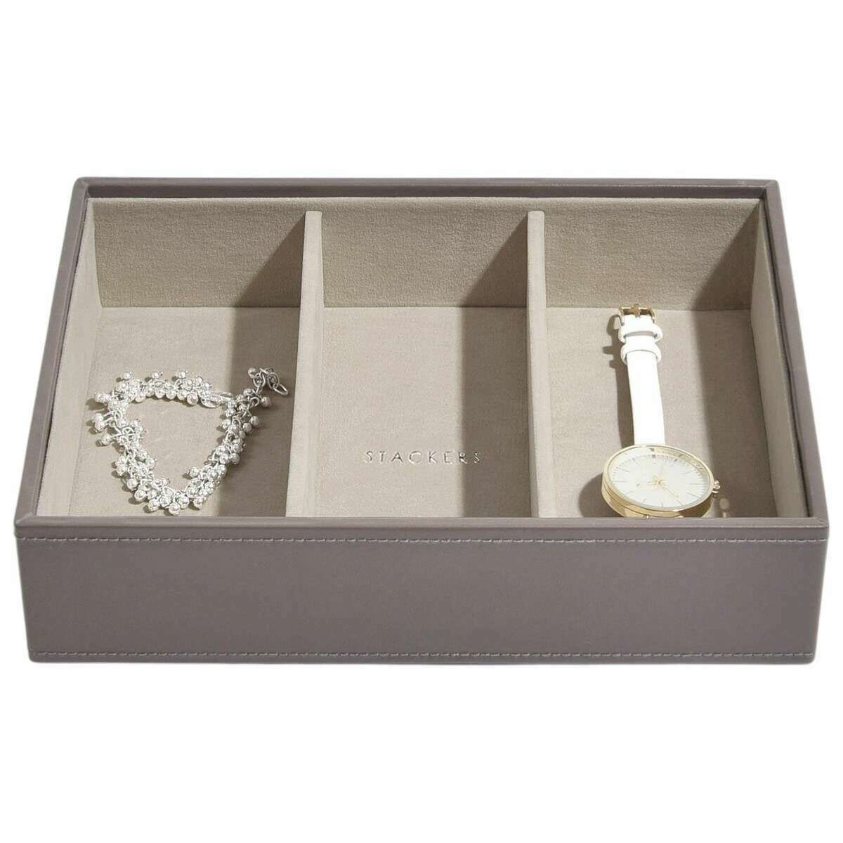 Este juego de 4 joyeros clásicos para mujer de Stackers, bien hecho, viene en color marrón visón y está fabricado en piel sintética y terciopelo. Mide 19,5 cm (alto) x 25 cm (ancho) x 18 cm (profundidad). Se recomienda limpiar con un paño para mantener este joyero en buenas condiciones. Todos los joyeros se entregan completos con embalaje apilador. El juego de 4 joyeros Stackers Classic - Mink Brown seguramente impresionará por su increíble cantidad de espacio. Con una sección con tapa superior para esas pequeñas piezas preciosas, una bandeja central de 25 secciones para esos dijes o anillos, otra bandeja intermedia con tres secciones para sostener sus pulseras y collares con rollos de anillos para almacenar más anillos y aretes, y luego en la parte inferior hay una caja profunda de tres secciones para los artículos más grandes como pulseras grandes, relojes y gafas de sol. Haga de este el joyero más ideal que pueda tener, ya que ofrece mucho de la manera más lujosa.