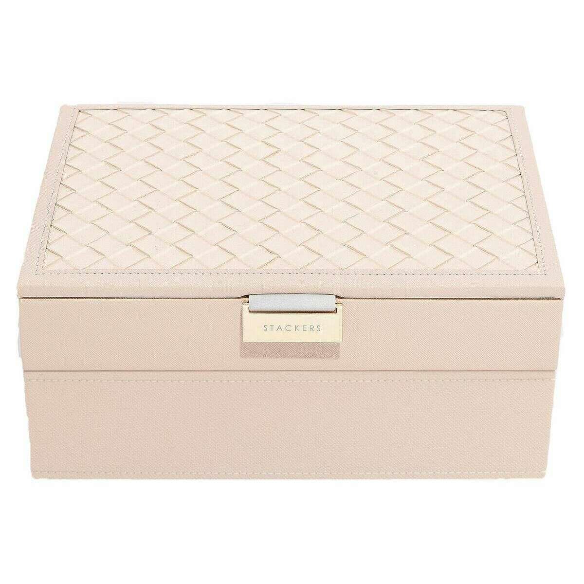 Designer Stackers te ha traído este joyero de piel sintética y terciopelo para mujer en tonos tejidos de color rosa rubor. Mide 11 cm (alto) x 25 cm (ancho) x 18 cm (profundidad). Todos los joyeros se entregan completos con embalaje apilador. El juego de 2 joyeros Stackers Classic - Tejido rosa rubor presenta un diseño único de joyero tejido en rosa. ¡Este joyero es perfecto para guardar todas tus joyas! Viene completo con dos capas y secciones de varios tamaños para aretes y pulseras y una sección más grande para relojes y pulseras.
