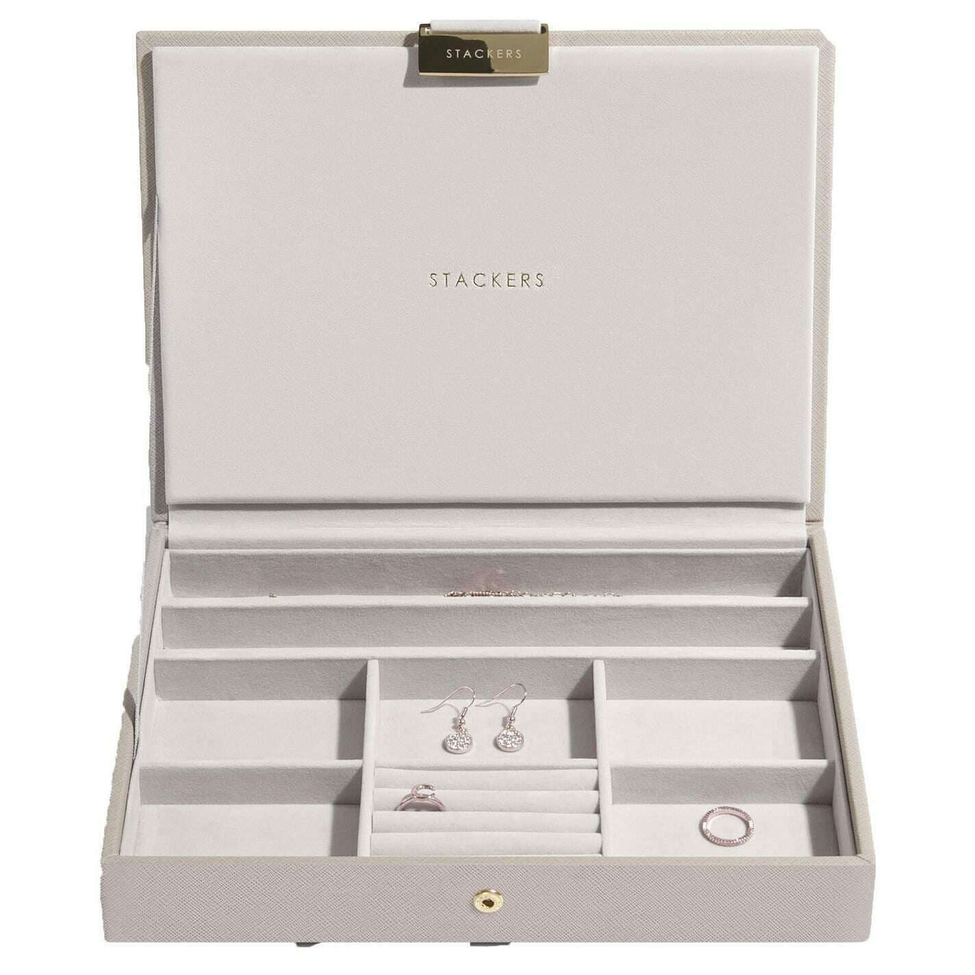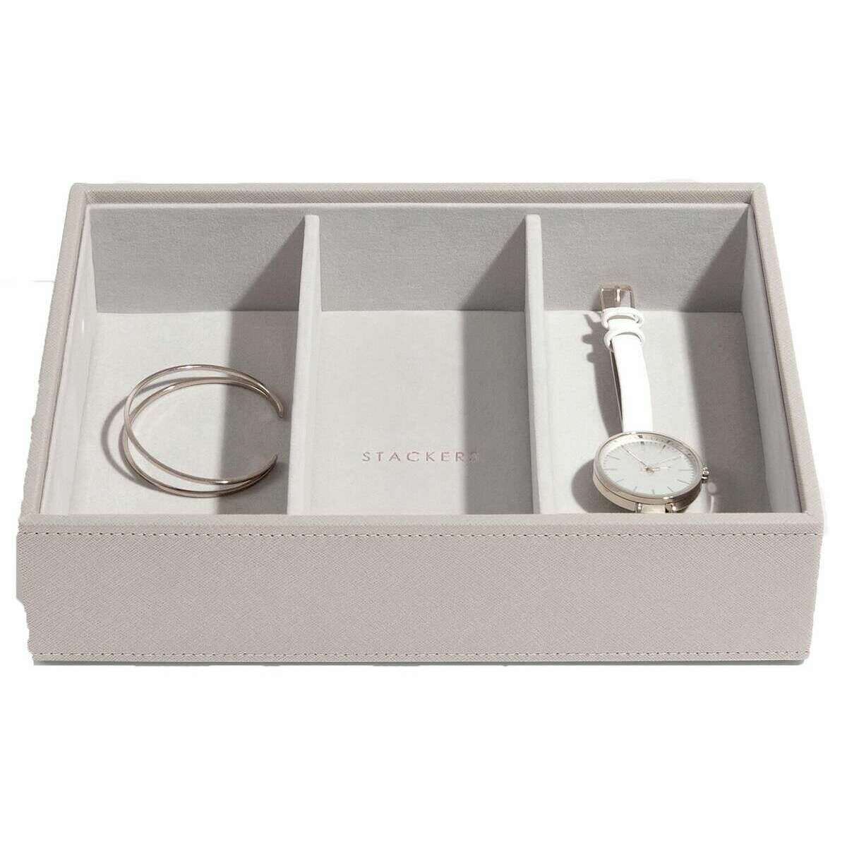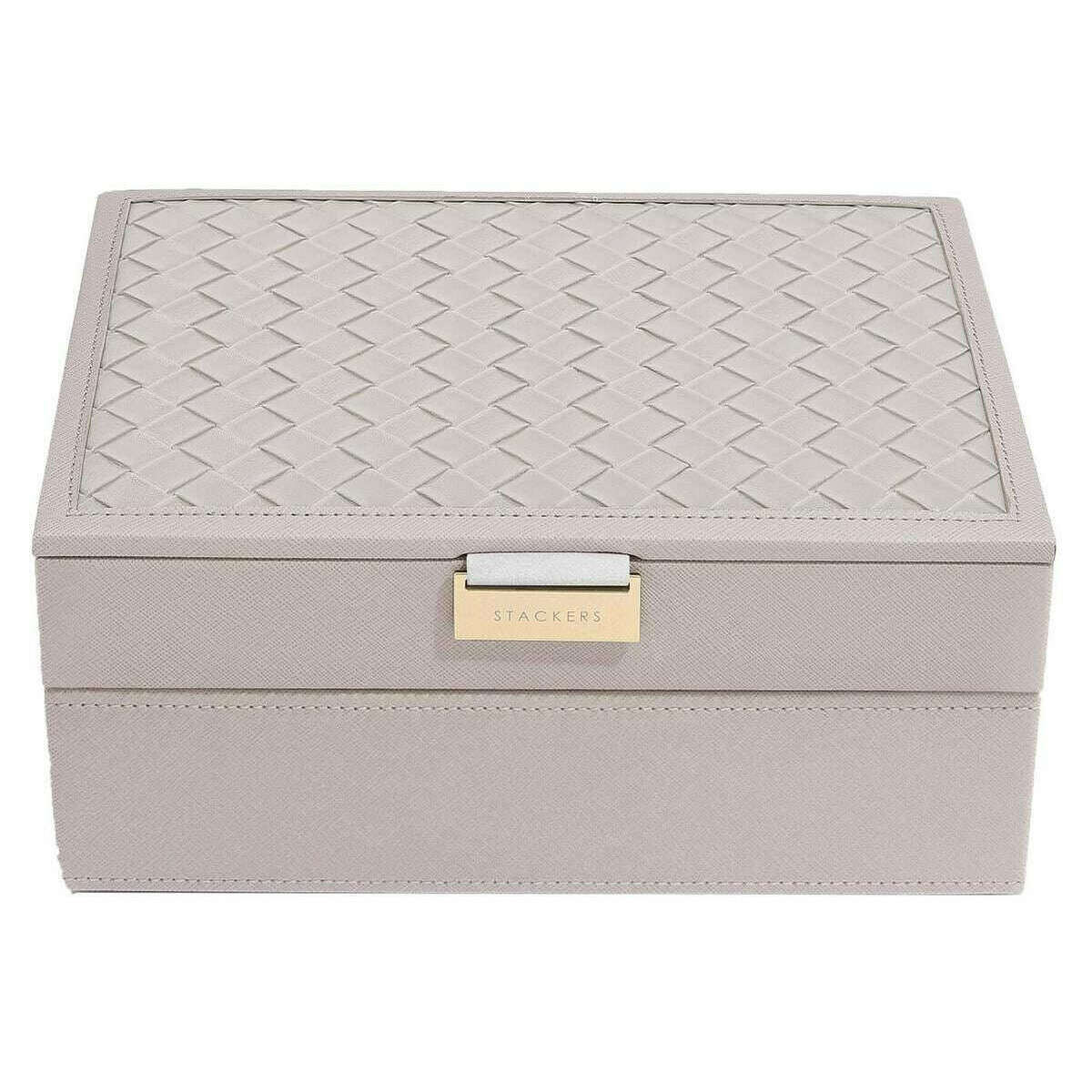 Presentamos este clásico juego de 2 joyeros para mujer de Stackers, fabricado en piel sintética y terciopelo en color topo. Mide 11 cm (alto) x 25 cm (ancho) x 18 cm (profundidad). Todos los joyeros se entregan completos con embalaje apilador. El juego de 2 joyeros Stackers Classic - Taupe presenta un diseño clásico de joyero en color topo. ¡Este joyero es perfecto para guardar todas tus joyas! Viene completo con dos capas y secciones de varios tamaños para aretes y pulseras y una sección más grande para relojes y pulseras.