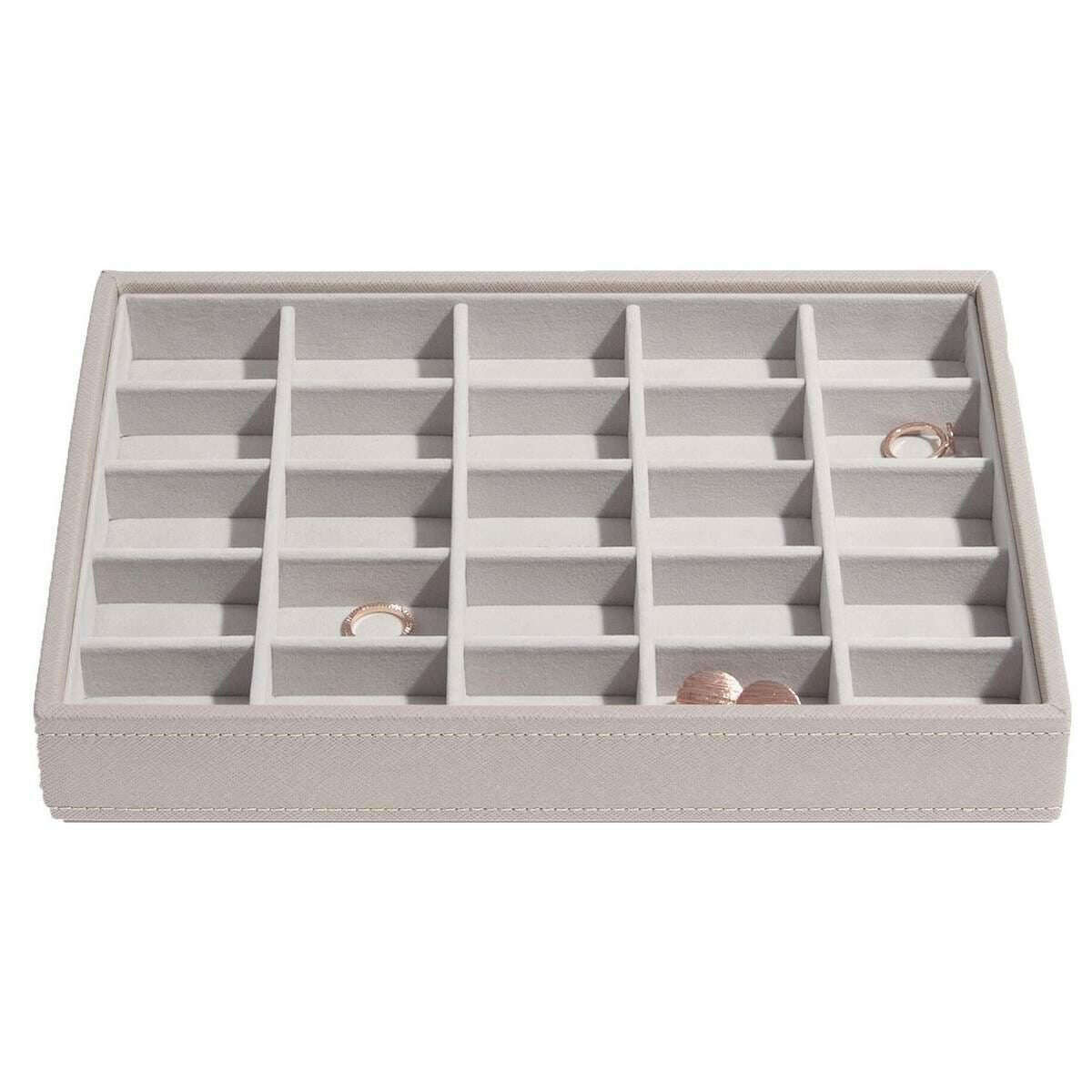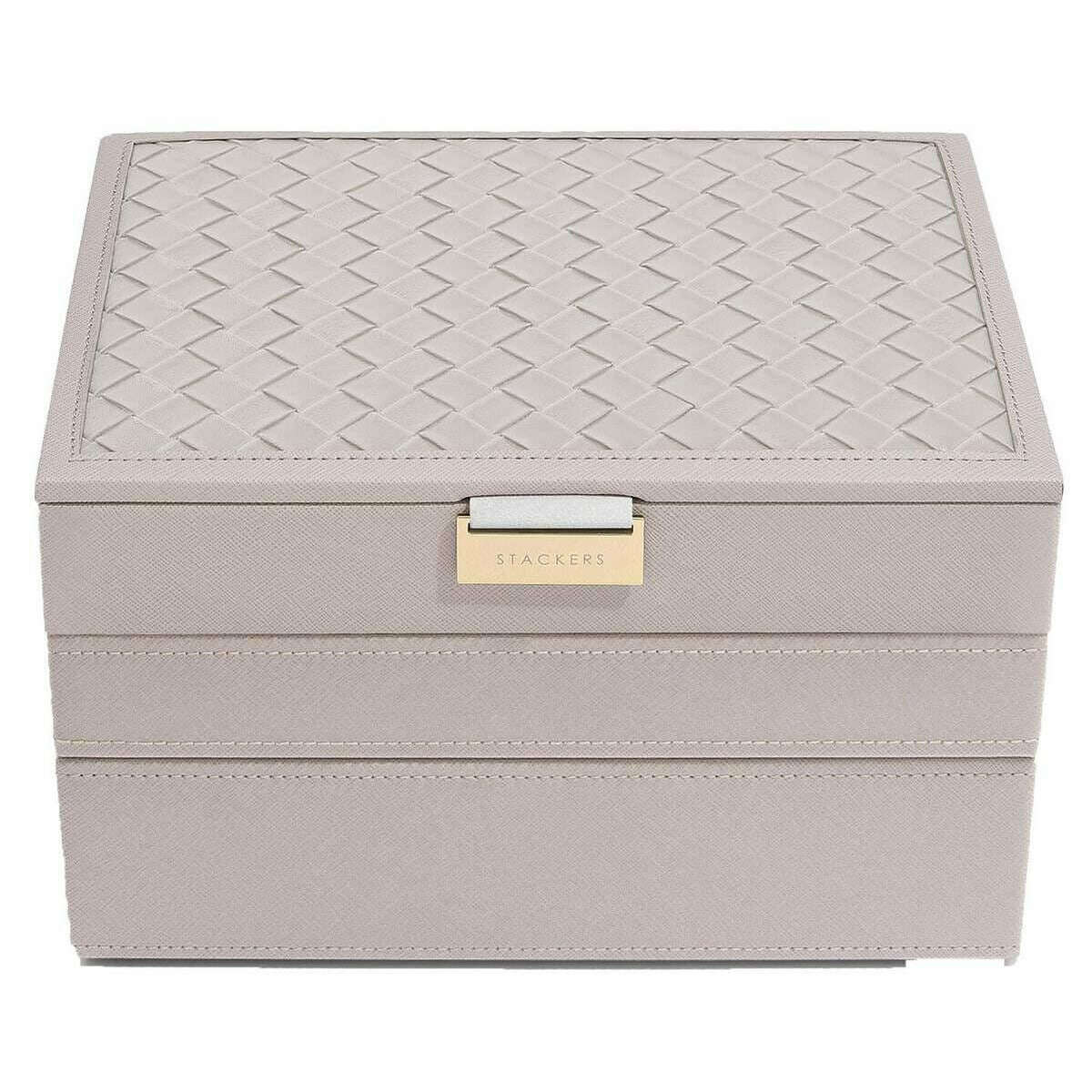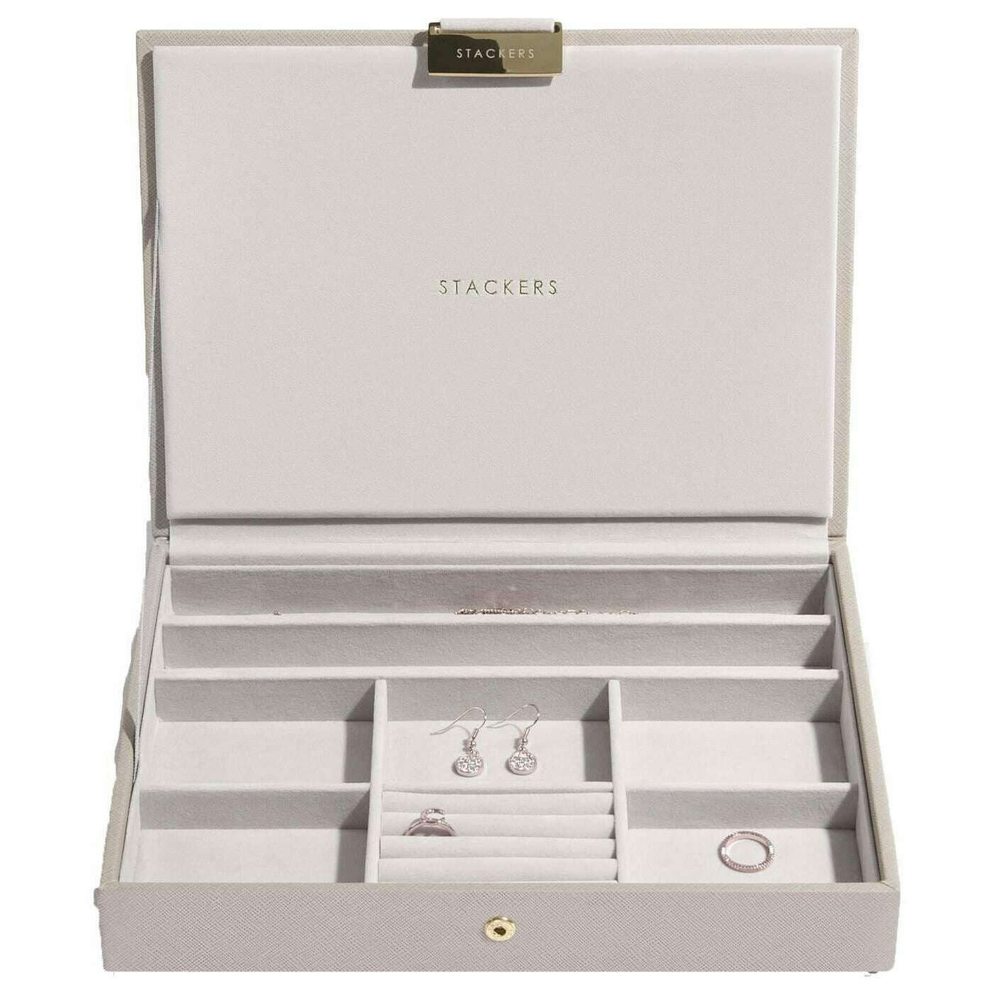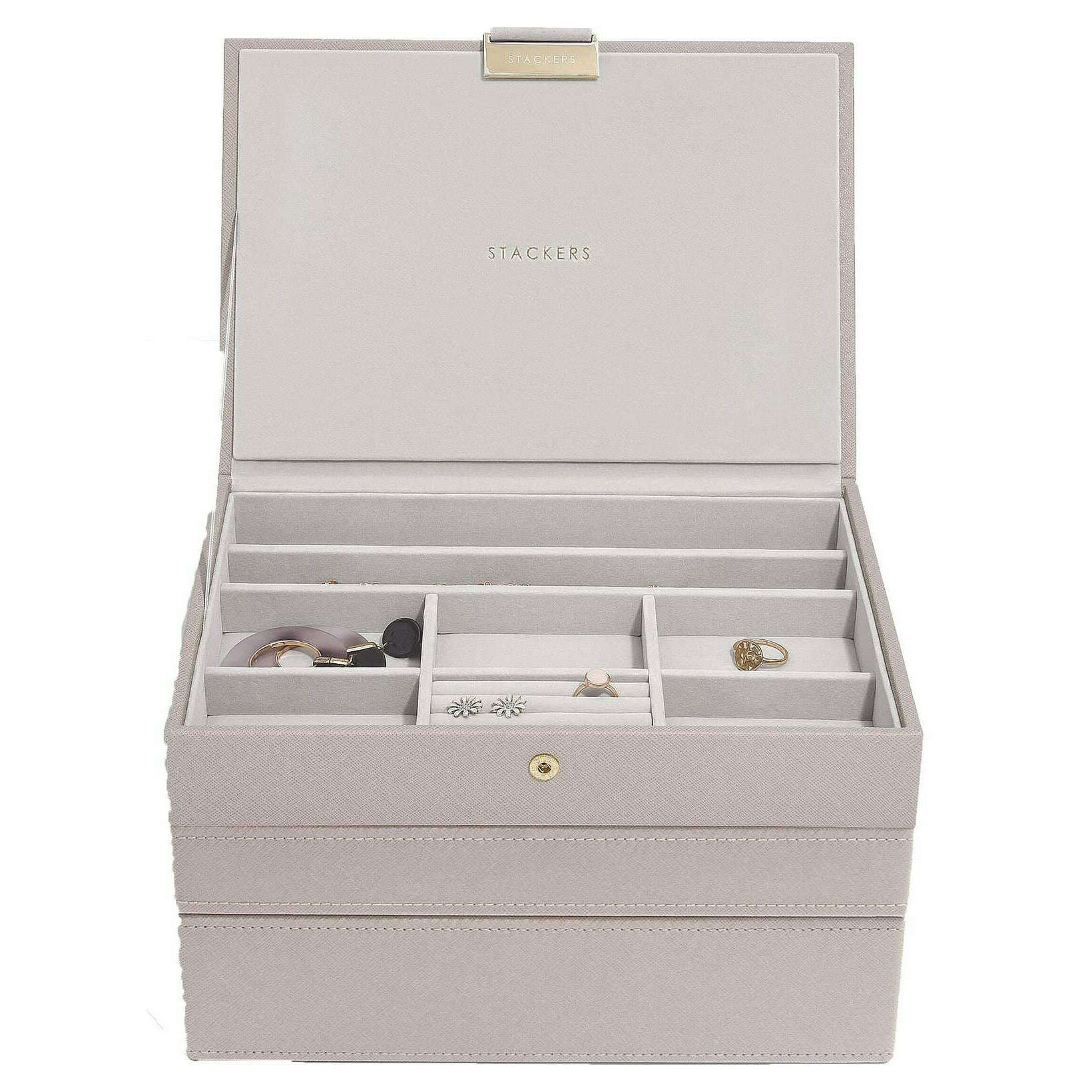 Perfecto para las mujeres es este juego de 3 joyeros clásicos en color topo de Stackers; también está hecho de piel sintética y terciopelo. Mide 13,7 cm (alto) x 25 cm (ancho) x 18 cm (profundidad). Todos los joyeros se entregan completos con embalaje apilador. El juego de 3 joyeros Stackers Classic - Taupe presenta un diseño clásico de joyero en color topo. ¡Este joyero es perfecto para guardar todas tus joyas! Viene completo con tres capas y secciones de varios tamaños para aretes, anillos y pulseras y una sección más grande para relojes y pulseras.