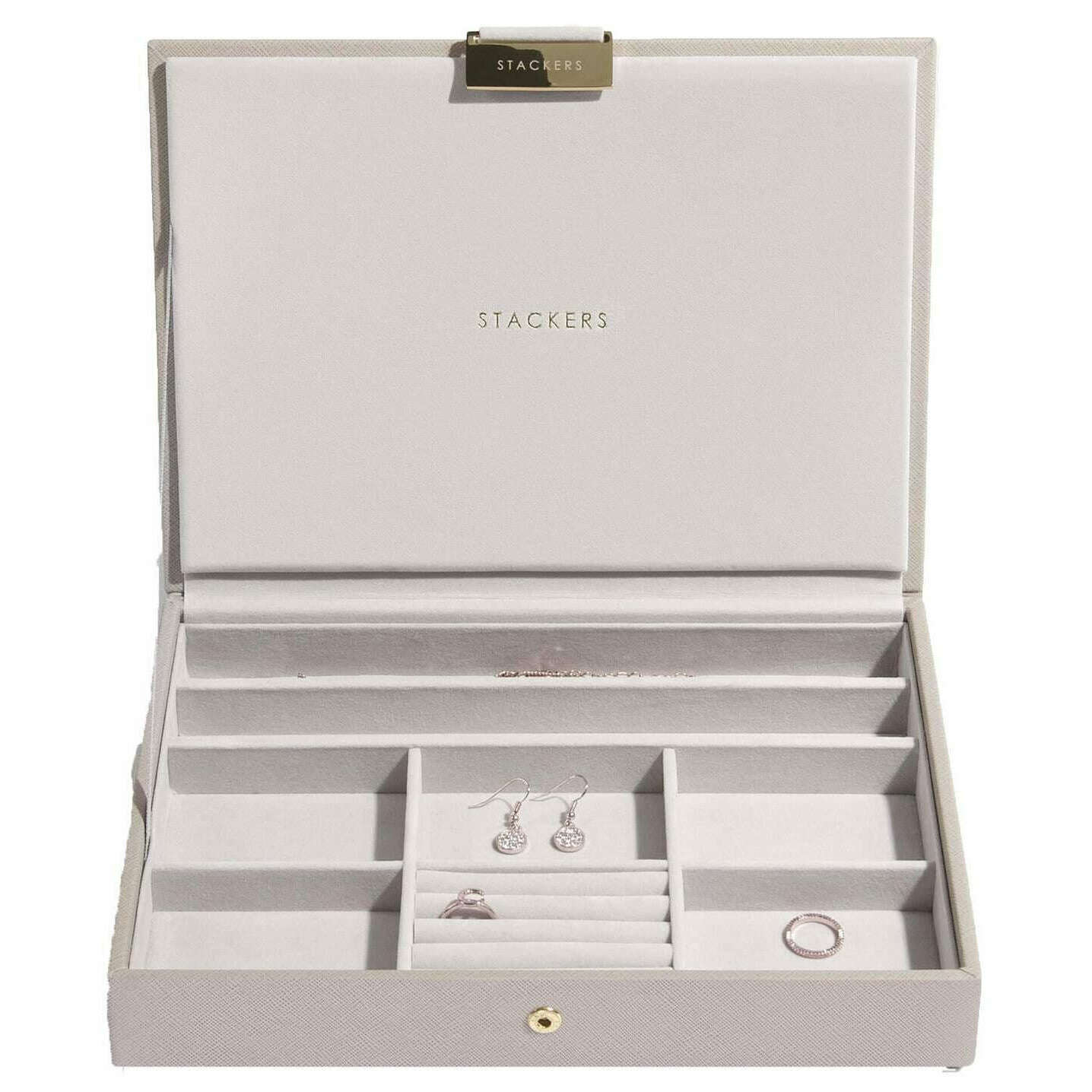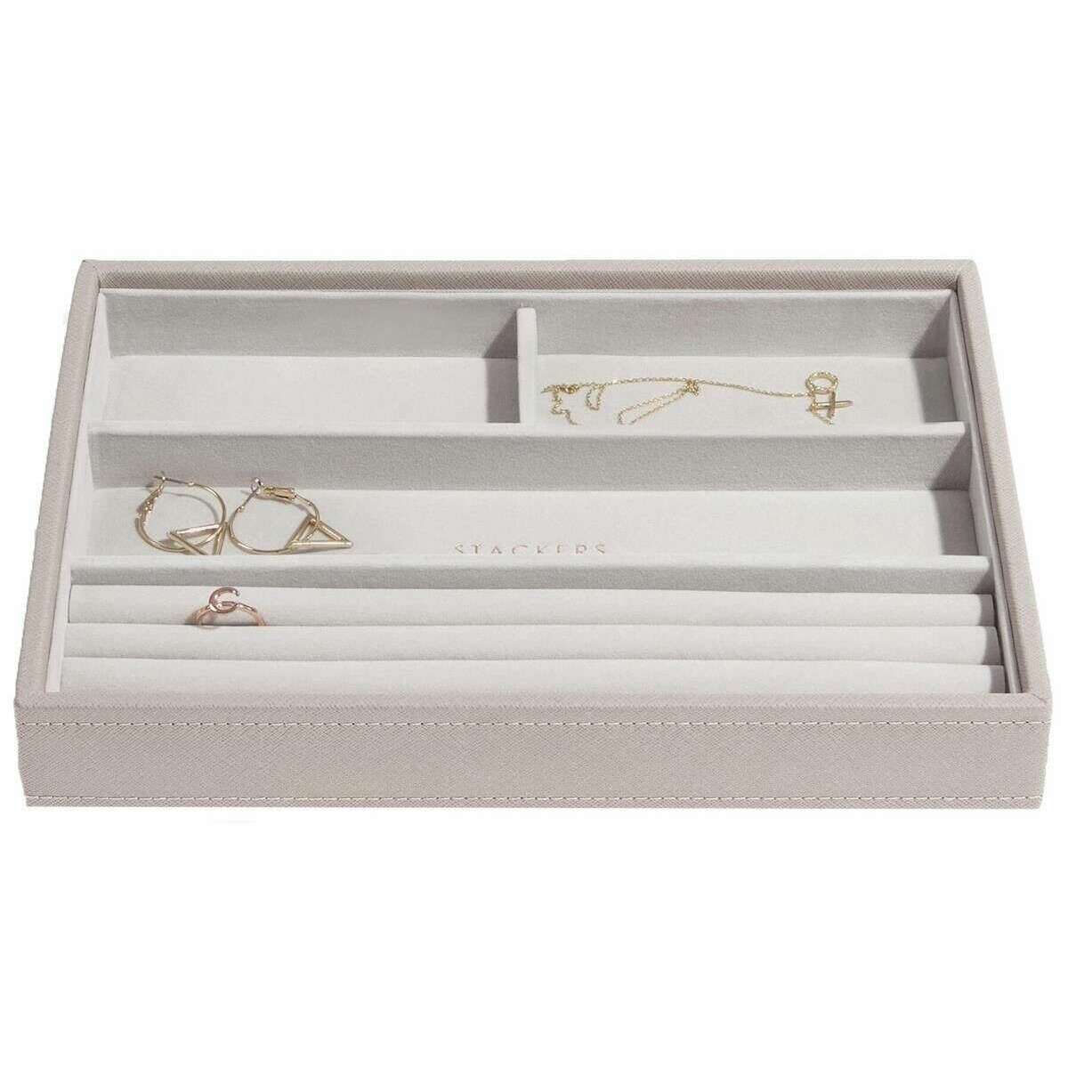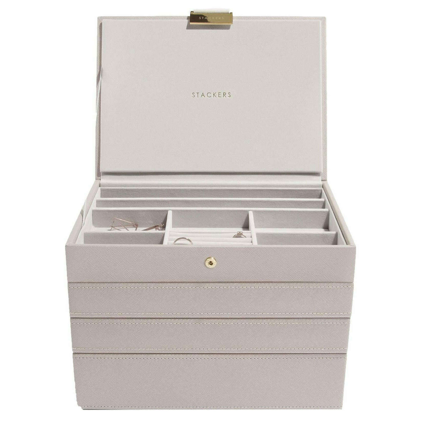 Fabricado en piel sintética y terciopelo, este clásico juego de 4 joyeros de color topo para mujer del diseñador Stackers. Mide 19,5 cm (alto) x 25 cm (ancho) x 18 cm (profundidad). Todos los joyeros se entregan completos con embalaje apilador. El juego de 4 joyeros Stackers Classic - Taupe presenta un diseño clásico de joyero en color topo. ¡Este joyero es perfecto para guardar todas tus joyas! Viene completo con cuatro capas y secciones de varios tamaños para aretes, anillos y pulseras y una sección más grande para relojes y pulseras.
