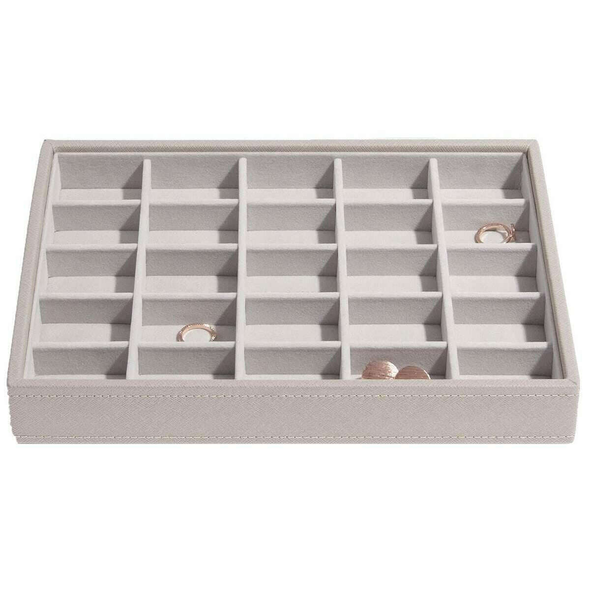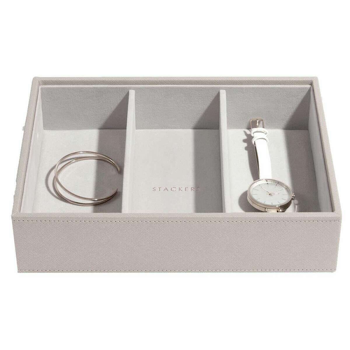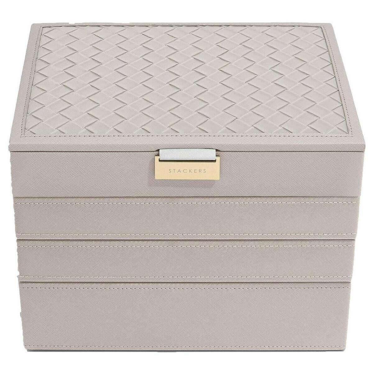 Fabricado en piel sintética y terciopelo, este clásico juego de 4 joyeros de color topo para mujer del diseñador Stackers. Mide 19,5 cm (alto) x 25 cm (ancho) x 18 cm (profundidad). Todos los joyeros se entregan completos con embalaje apilador. El juego de 4 joyeros Stackers Classic - Taupe presenta un diseño clásico de joyero en color topo. ¡Este joyero es perfecto para guardar todas tus joyas! Viene completo con cuatro capas y secciones de varios tamaños para aretes, anillos y pulseras y una sección más grande para relojes y pulseras.