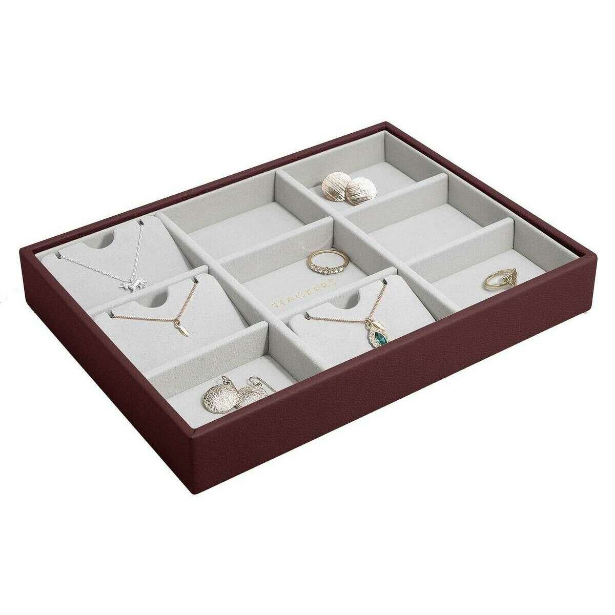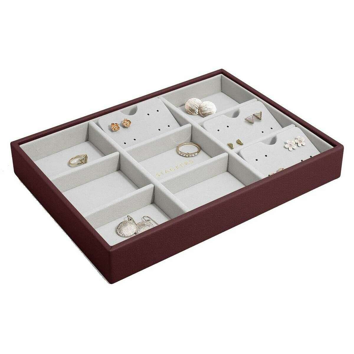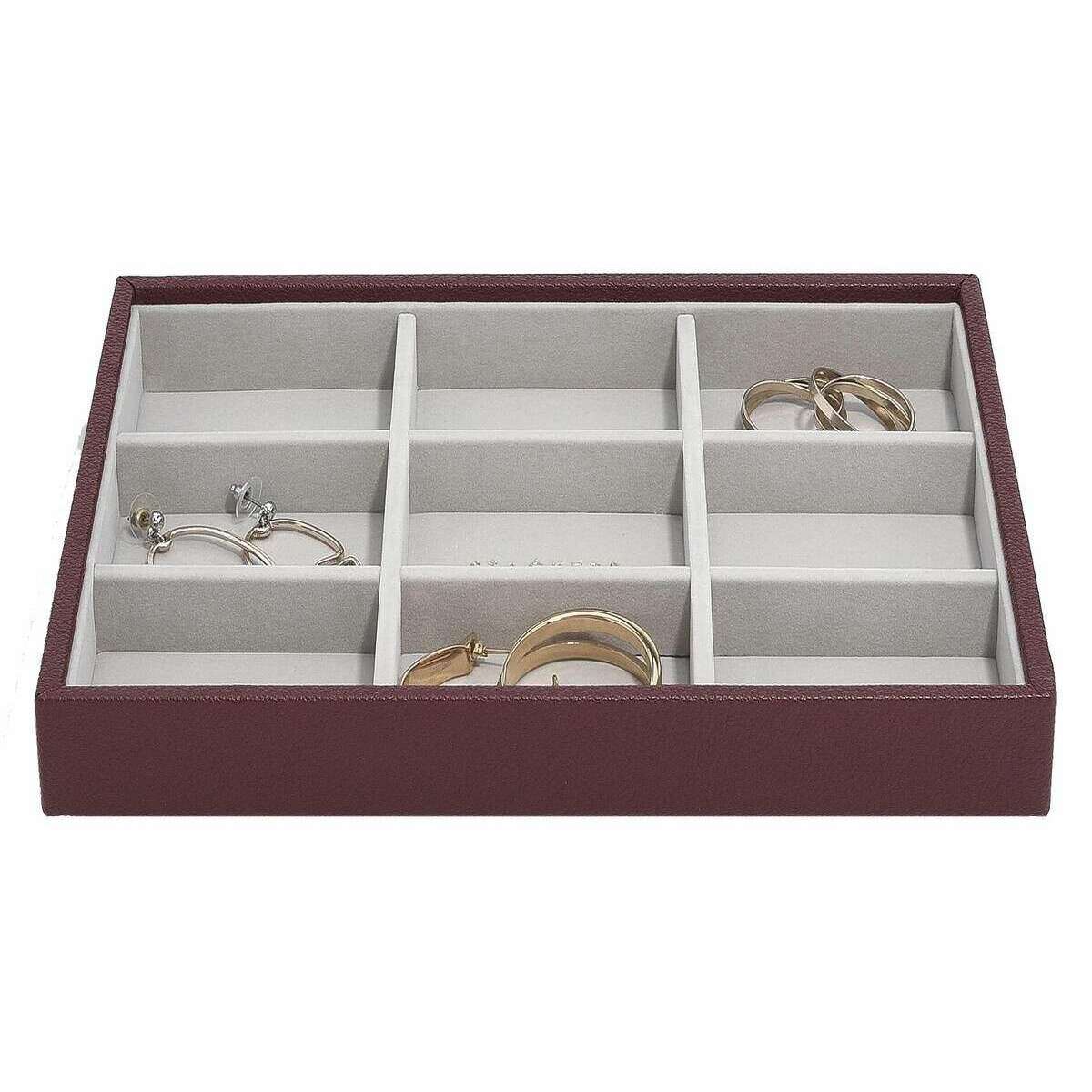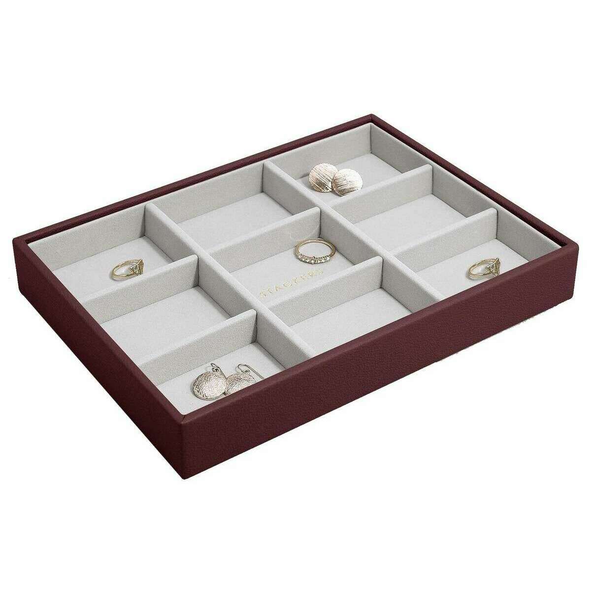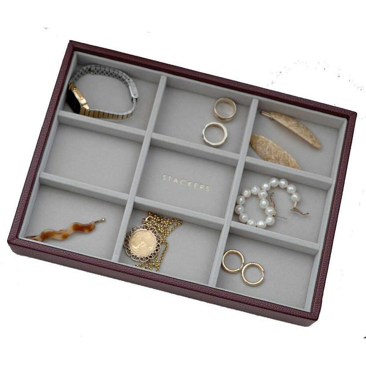 Confeccionada en piel sintética y terciopelo, esta clásica capa burdeos para mujer del diseñador Stackers. Mide 3,7 cm (alto) x 25 cm (ancho) x 18 cm (profundidad). Todos los joyeros se entregan completos con embalaje apilador. La capa Stackers Classic Statement Layer - Borgoña presenta múltiples secciones para todos sus anillos y aretes. Esta hermosa capa de joyería clásica en color burdeos es perfecta para mantenerla organizada ya que tiene un accesorio colgante o un pendiente en cada sección.