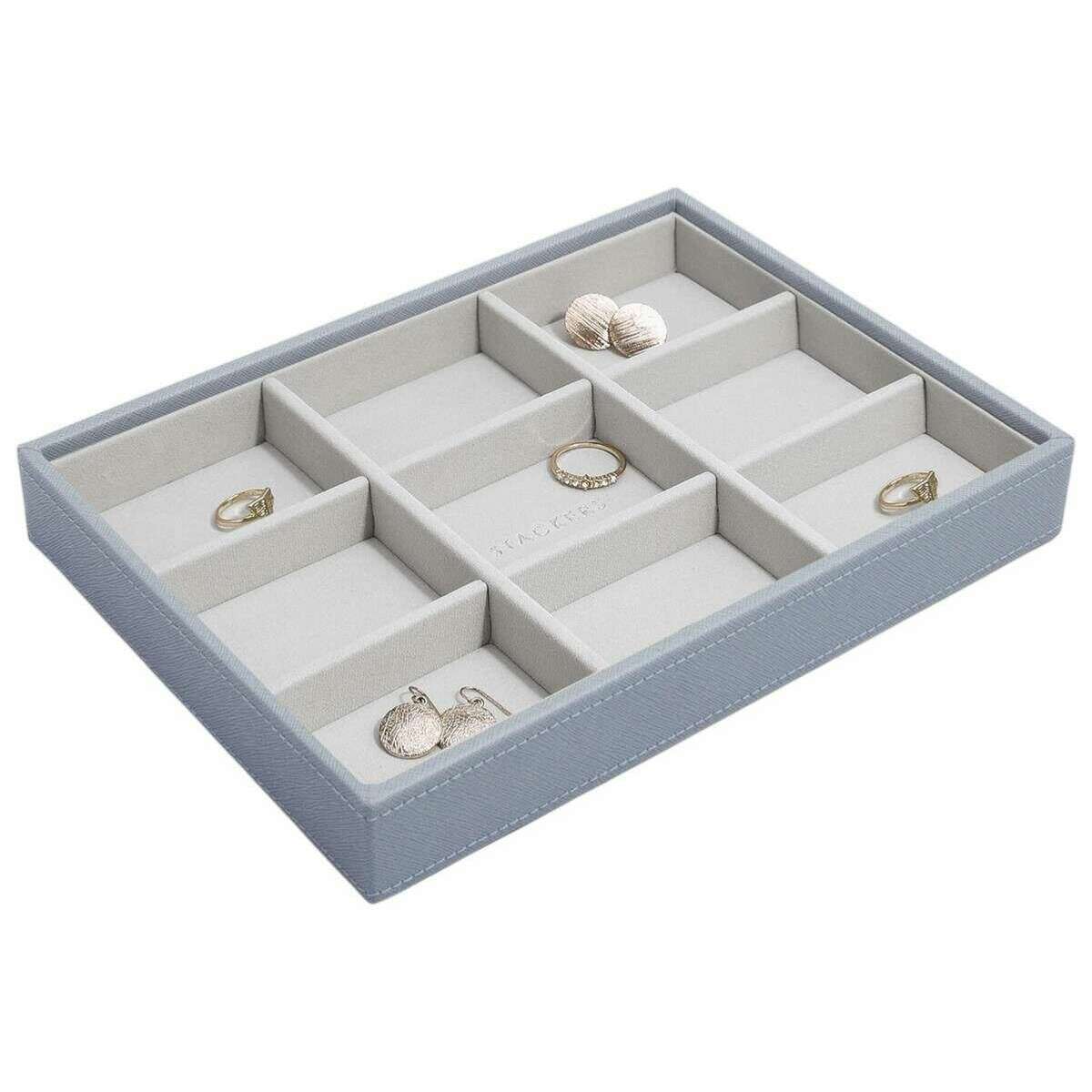 El diseñador Stackers te ha traído este joyero de piel sintética y terciopelo para mujer en tonos azul oscuro. Mide 3,7 cm (alto) x 25 cm (ancho) x 18 cm (profundidad). Se recomienda limpiar con un paño para mantener este joyero en buenas condiciones. Todos los joyeros se entregan completos con embalaje apilador. La capa Stackers Classic Statement - Dusky Blue ha sido ingeniosamente creada y diseñada para sujetar perfectamente todos tus aretes, anillos o clips para el cabello. Se puede añadir a cualquier otra bandeja de joyería clásica para crear un joyero o se puede utilizar sola. No tendrás que hacer concesiones en materia de organización.