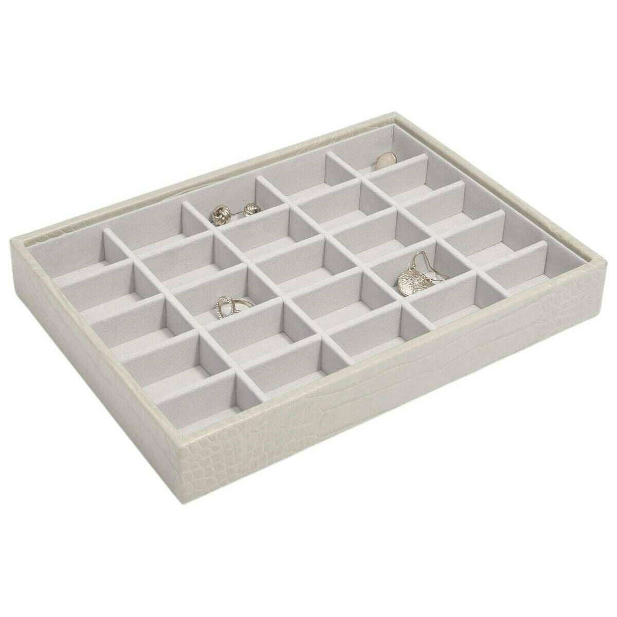 Esta clásica capa de baratijas para mujer de Stackers, bien hecha, viene en un color gris masilla y está fabricada con piel sintética y terciopelo. Mide 3,7 cm (alto) x 25 cm (ancho) x 18 cm (profundidad). Se recomienda limpiar con un paño para mantener este joyero en buenas condiciones. Todos los joyeros se entregan completos con embalaje apilador. La capa Stackers Classic Trinket - Putty Grey es una excelente capa para joyas más pequeñas como anillos, aretes o dijes. Con 25 compartimentos iguales, es un organizador sencillo pero práctico para tus joyas sueltas, de modo que puedas guardarlas de forma segura en un solo lugar para cuando necesites cogerlas. El delicioso forro de terciopelo es suave contra su accesorio, manteniéndolo en perfectas condiciones. Esta pieza se puede combinar con otras piezas de Stackers para crear un joyero personalizado que se ajuste a sus necesidades.