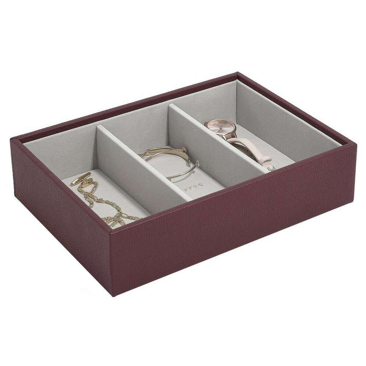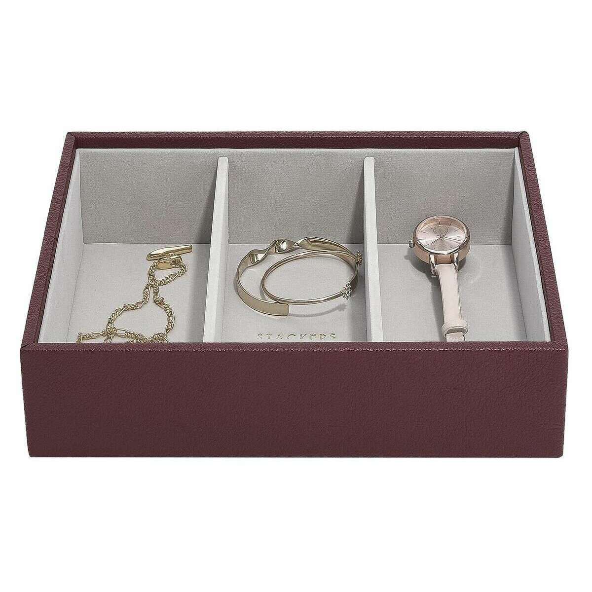 Con piel sintética y terciopelo de color burdeos, esta clásica capa de accesorios para relojes de Stackers es perfecta para las mujeres y es imprescindible. Mide 6 cm (alto) x 25 cm (ancho) x 18 cm (profundidad). Todos los joyeros se entregan completos con embalaje apilador. La capa de accesorios para relojes Stackers Classic - Borgoña cuenta con tres secciones más grandes para cualquiera de sus artículos de joyería más grandes. Esta hermosa capa de joyería de color burdeos es perfecta para guardar artículos más grandes, como gafas de sol, relojes y pulseras.
