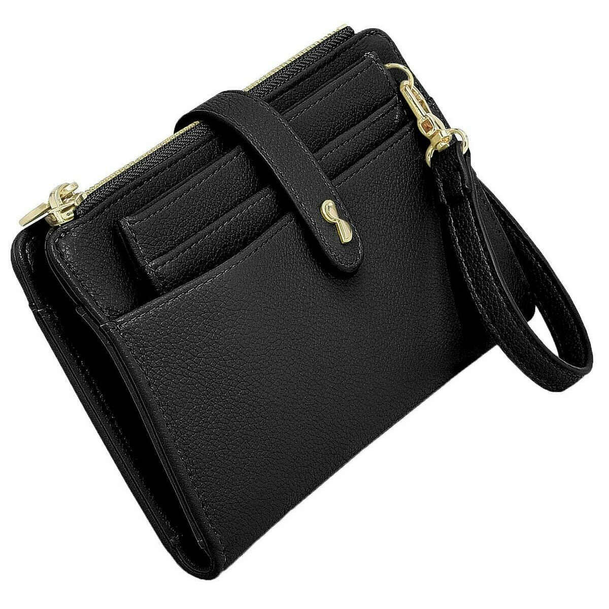 • Bolsillo externo para teléfono , 6 Ranuras para Tarjetas , Espejo de aumento , Monedero extraíble con cremallera , Correa de muñeca extraíble , Cierre con botones automáticos