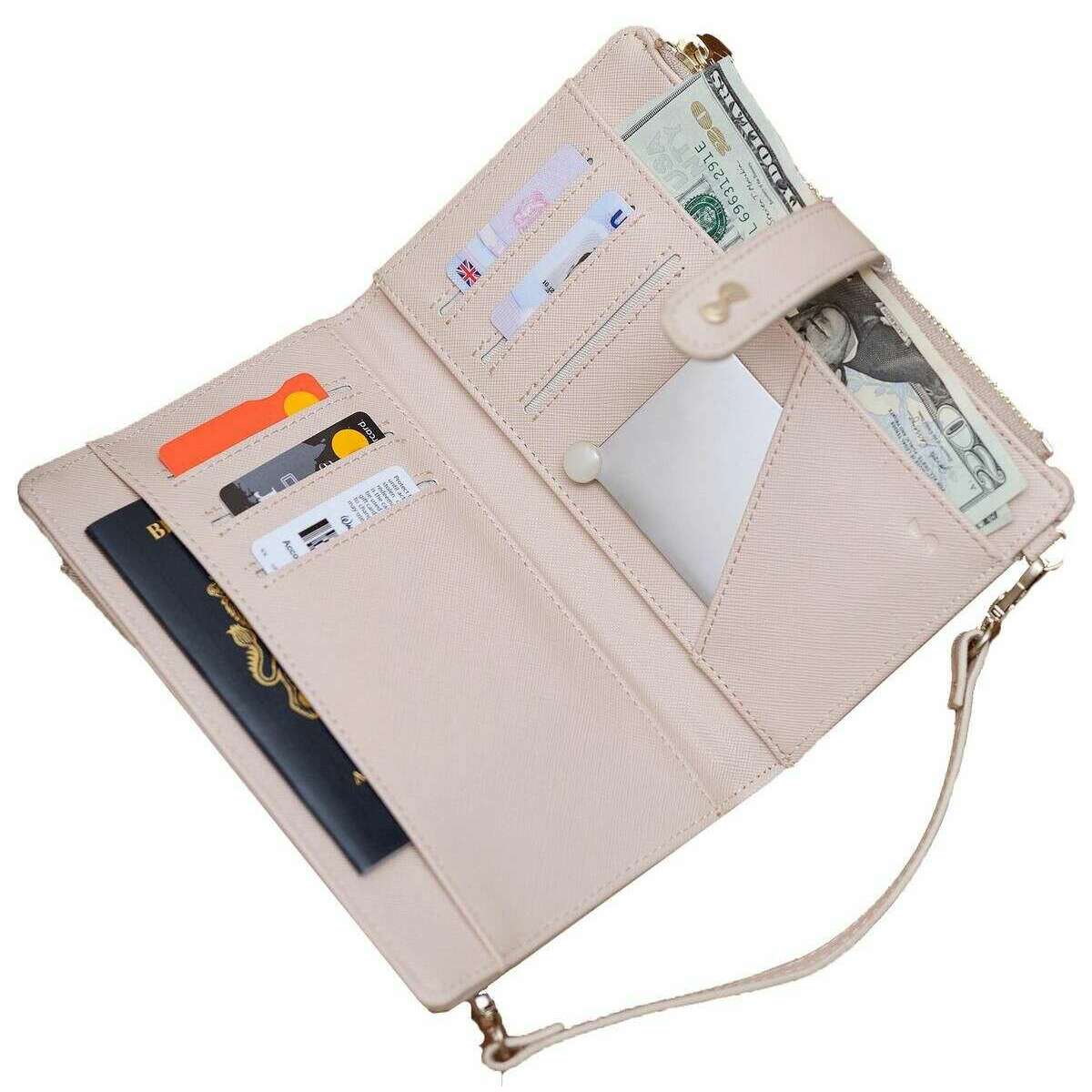 • Bolsillo externo para teléfono , 6 Ranuras para Tarjetas , Espejo de aumento , Monedero extraíble con cremallera , Correa de muñeca extraíble , Cierre con botones automáticos