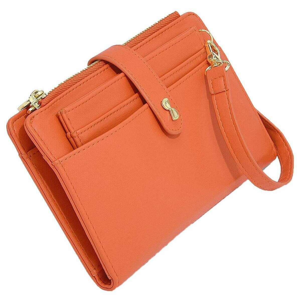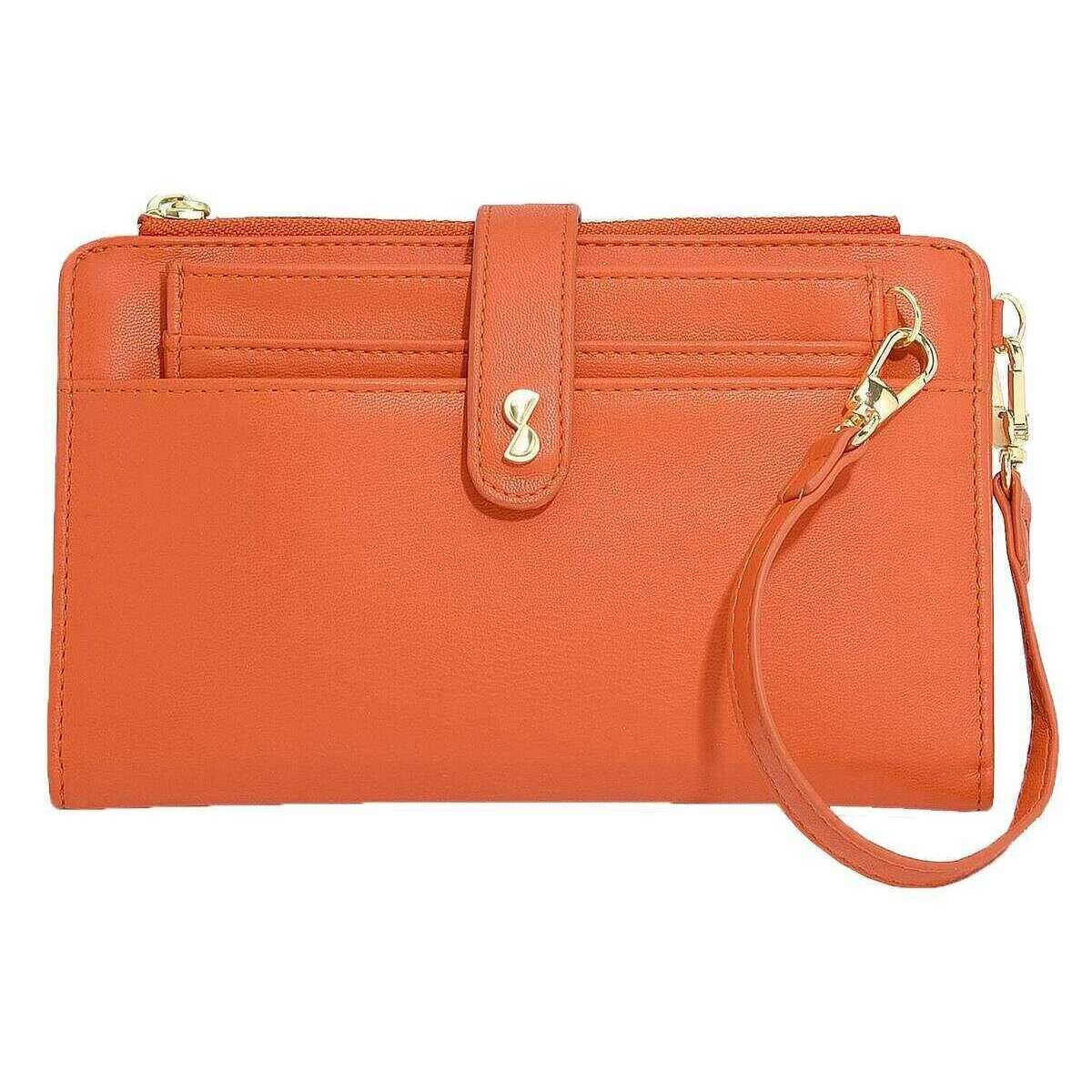 Este bolso grande de mujer de color naranja del diseñador Stackers está confeccionado en piel sintética. Mide 12,5 cm (alto) x 19,5 cm (ancho) x 3 cm (profundidad). Todos los bolsos vienen completos con embalaje apilador. ¡El bolso grande Stackers - Naranja es imprescindible cuando estás en movimiento! Este clásico y moderno bolso naranja cuenta con múltiples bolsillos para dinero y tarjetas, un tarjetero extraíble y un espejo cosmético. Viene completo con una correa para la muñeca extraíble y un bolsillo externo para el teléfono. ¡Perfecto para cualquier salida!