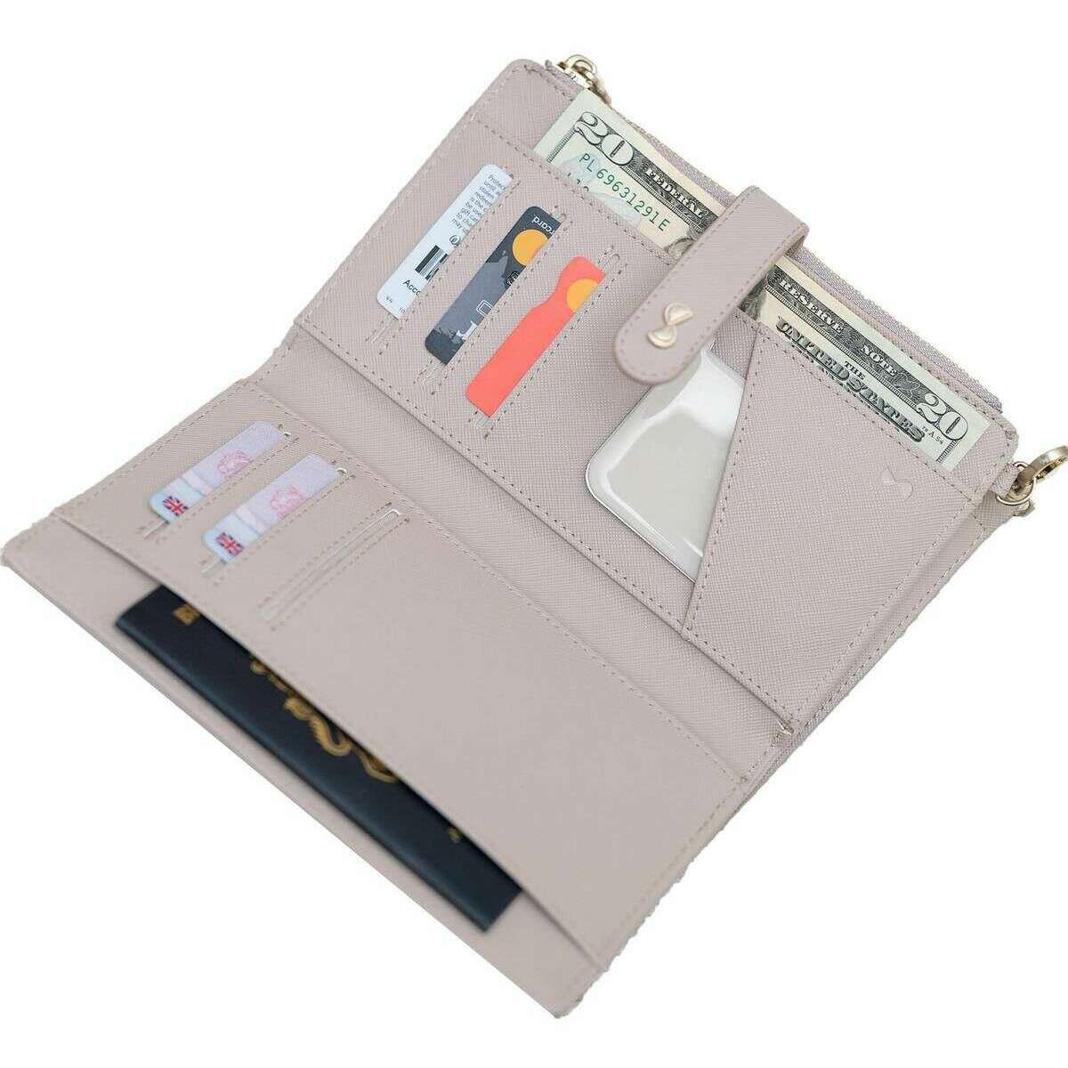 • Bolsillo externo para teléfono , 6 Ranuras para Tarjetas , Espejo de aumento , Monedero extraíble con cremallera , Correa de muñeca extraíble , Cierre con botones automáticos