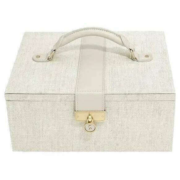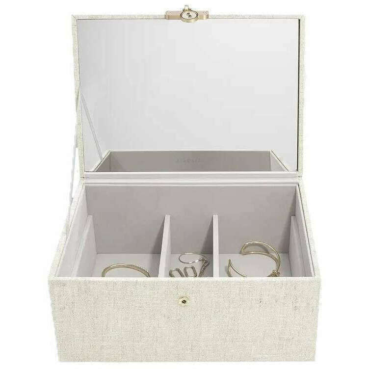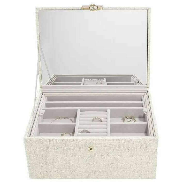 Este joyero clásico de lujo de lujo de Well Hecho de los apiladores viene en un color beige de avena/lino y se fabrica con cuero y lino falso. Mide 11.5 cm (altura) x 25 cm (ancho) x 18 cm (profundidad). Todas las joyas se completan en el embalaje de apiladores. El cuadro de joyería clásica de lujo de los apiladores: avena/lino beige magníficamente elaborado para darle a su habitación un toque especial de femenino mientras mantiene sus joyas y accesorios seguros y libres de polvo o daño. La sección superior de esta caja presenta dos secciones largas para pulseras y collares, cuatro compartimentos para pulseras pequeñas, aretes más grandes u otros accesorios y un rollo de anillo para aretes y anillos. La parte inferior es un cuadro profundo de tres secciones para aquellos artículos más grandes como pulseras grandes, relojes y gafas de sol. Completar este joyero perfecto está la tapa que tiene un espejo grande.