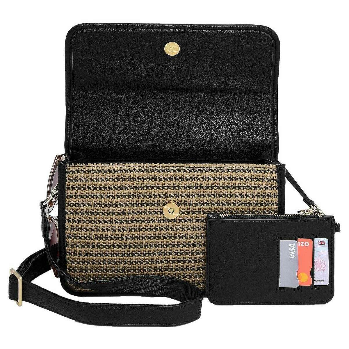 Presentamos este bolso bandolera de rafia para mujer de Stackers, está confeccionado en efecto rafia y piel sintética en color rafia negro. Mide 17 cm (alto) x 7,5 cm (ancho) x 25 cm (profundidad). Todas las bolsas se entregan completas con embalaje apilador. ¡El bolso bandolera Stackers Raffia - Black Raffia es imprescindible cuando estás en movimiento! Este exclusivo y moderno bolso bandolera de rafia negra cuenta con múltiples bolsillos, un espejo cosmético Stackers y un tarjetero extraíble. Perfecto para el uso diario con su correa cruzada ajustable y extraíble.