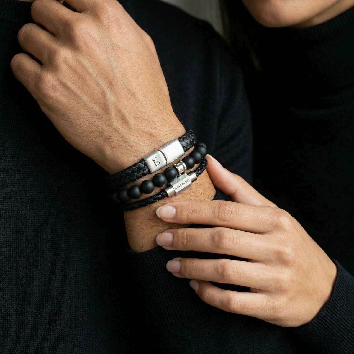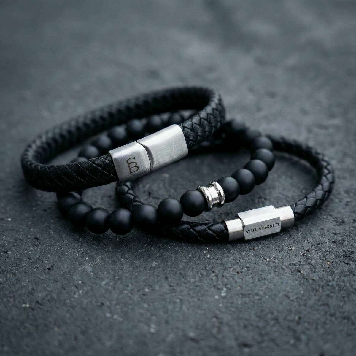 Presentamos este set de regalo con triple pulsera para hombre de Steel & Barnett, fabricado 100 % con cuero, acero inoxidable y piedras preciosas en color negro/plateado. Todas las pulseras vienen completas con una caja de regalo de acero y Barnett. El juego de regalo de pulsera triple Steel & Barnett - Negro/Plata presenta un trío elegante y sofisticado diseñado para el individuo moderno que valora el estilo refinado y la versatilidad. Este conjunto seleccionado incluye una pulsera de acero inoxidable, una pulsera de cuero y una pulsera de piedras preciosas redondas de 6 mm, cada una confeccionada en tonos negros que irradian elegancia discreta. Juntas, estas piezas crean un equilibrio armonioso de textura y diseño que combina la resistencia del acero, el atractivo atemporal del cuero y el encanto natural de las piedras preciosas pulidas. Ya sea que se use por separado para lograr un impacto sutil o en capas para una declaración más atrevida, el conjunto se adapta sin esfuerzo a cualquier guardarropa.