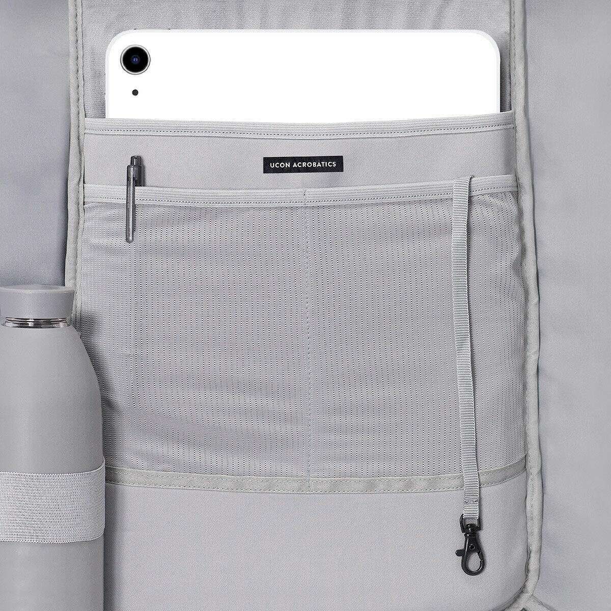 • Tapa enrollable para escalar el volumen que se puede cerrar fácil y rápidamente con cierre de gancho y bucle, la apertura principal se cierra además con dos botones a presión, acceso rápido al compartimento principal a través de una cremallera vertical, dos bolsillos externos a los lados, un bolsillo externo en el frente se cierra con una cremallera repelente al agua, compartimento interior de neopreno reciclado de alta calidad con amortiguador incorporado para una computadora portátil o tableta de 16", portabotellas elástico y llavero en el interior. Espalda reforzada con acolchado, Correas de hombro ajustables y acolchadas, Parte inferior acolchada para mayor seguridad y estabilidad, Etiqueta en relieve "Ucon Acrobatics" en la parte delantera, Impermeable, Vegano, Capacidad: 12 L