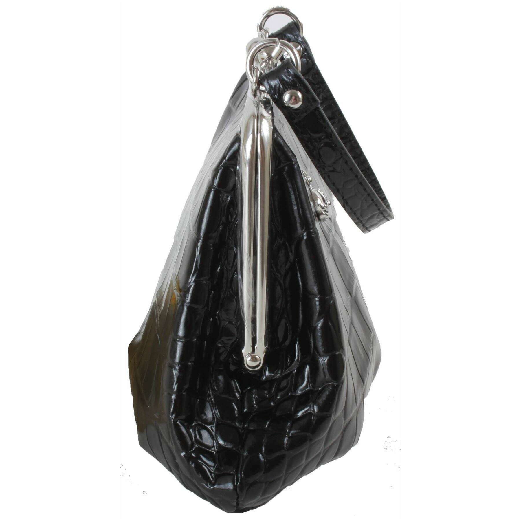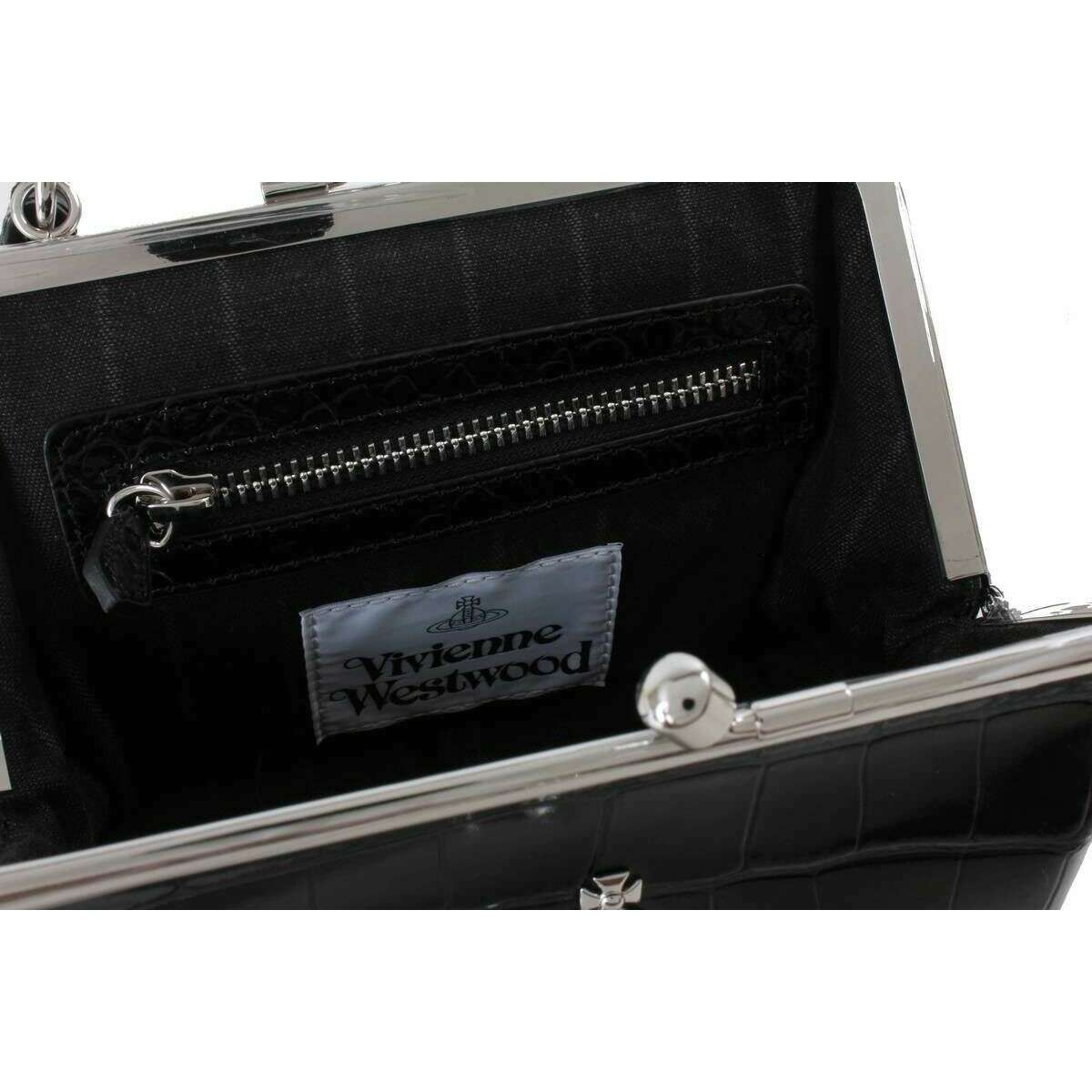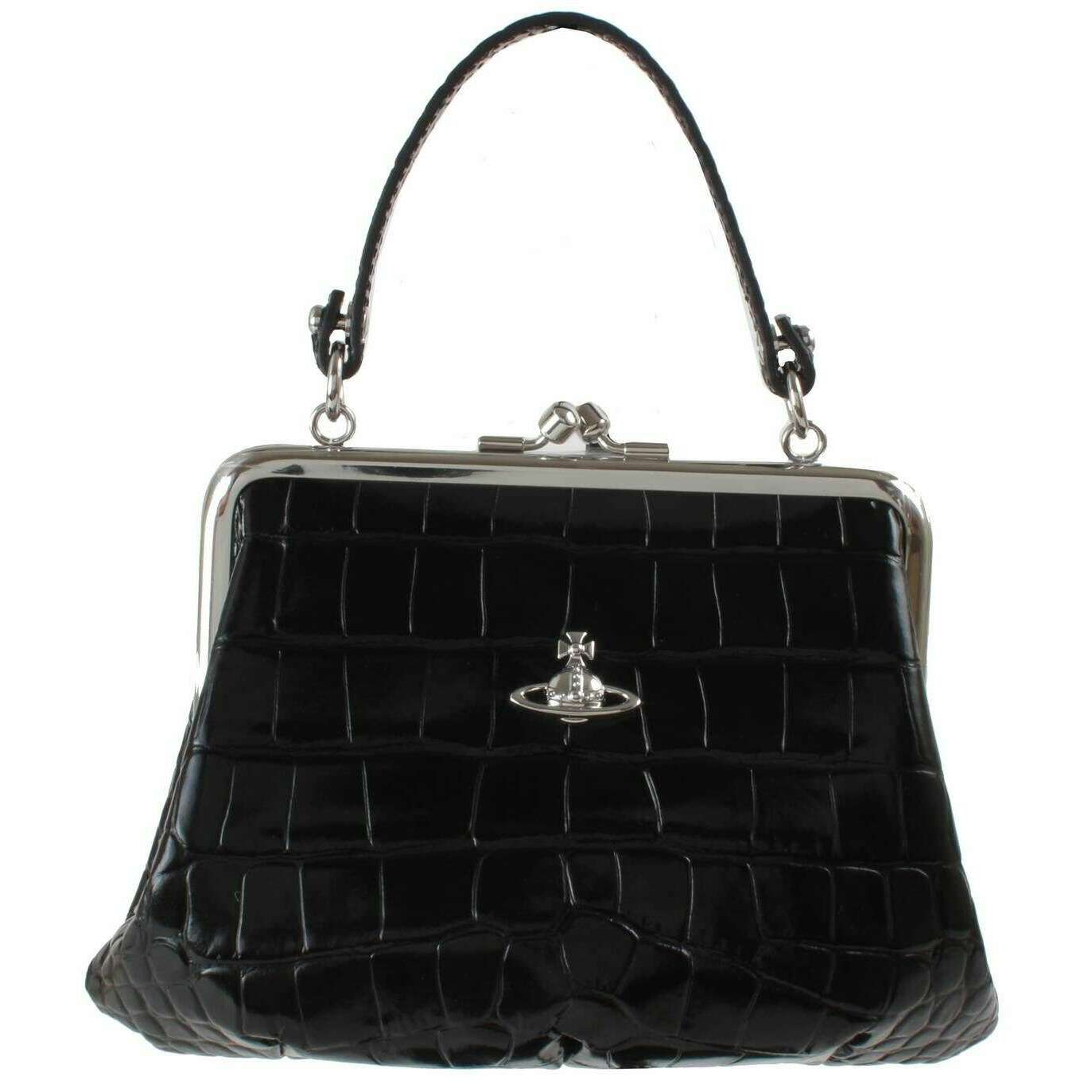 Este bolso con estructura de cocodrilo en relieve para mujer ha sido confeccionado 100 % piel de becerro, se presenta en color negro y es de la marca Vivienne Westwood. Mide 17 cm (alto) x 22 cm (ancho) x 5 cm (profundidad). Todas las bolsas vienen completas en un embalaje de vivienne westwood. El bolso Vivienne Westwood Embossed Croc Granny Frame - Negro es pequeño, compacto pero grande con un estilo elegante. Llévelo usando el asa superior o colóquelo con la impresionante correa de cadena para el hombro para una apariencia de manos libres. En el interior hay un bolsillo con cremallera, perfecto para guardar tus objetos esenciales más pequeños y el compartimento principal puede guardar cualquier otro objeto que necesites. Todo está asegurado con un cierre de beso atemporal y el bolso tiene un hermoso acabado con un motivo de orbe.